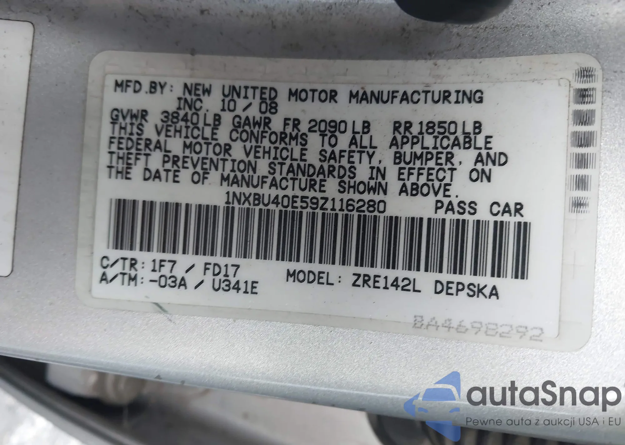 LOT: 44437055 VIN: 1NXBU40E59Z116280