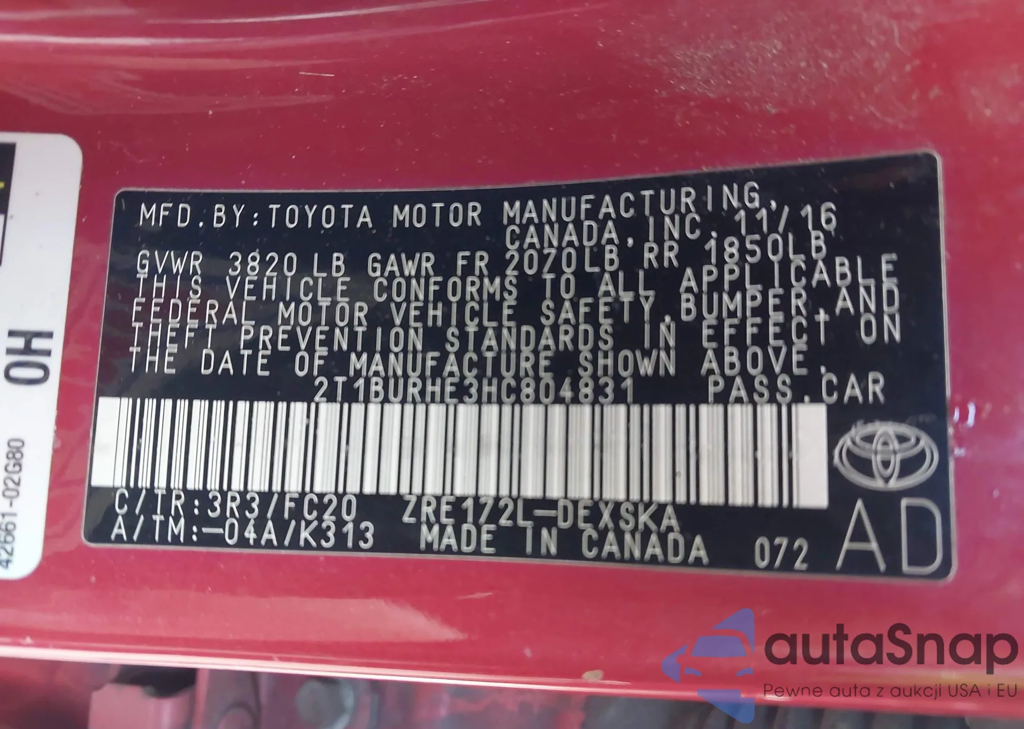 • VIN 2T1BURHE3HC804831