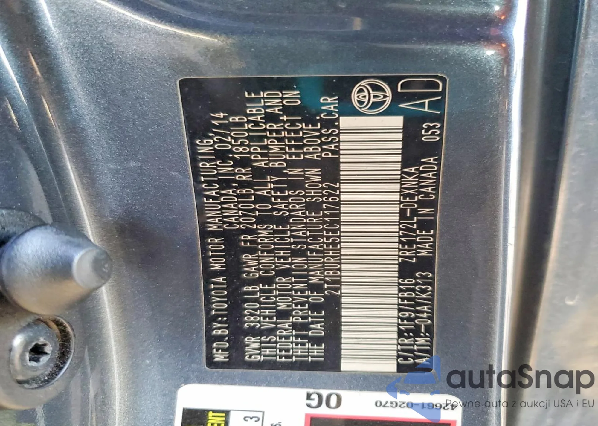 LOT: 44173115 VIN: 2T1BURHE7EC203742