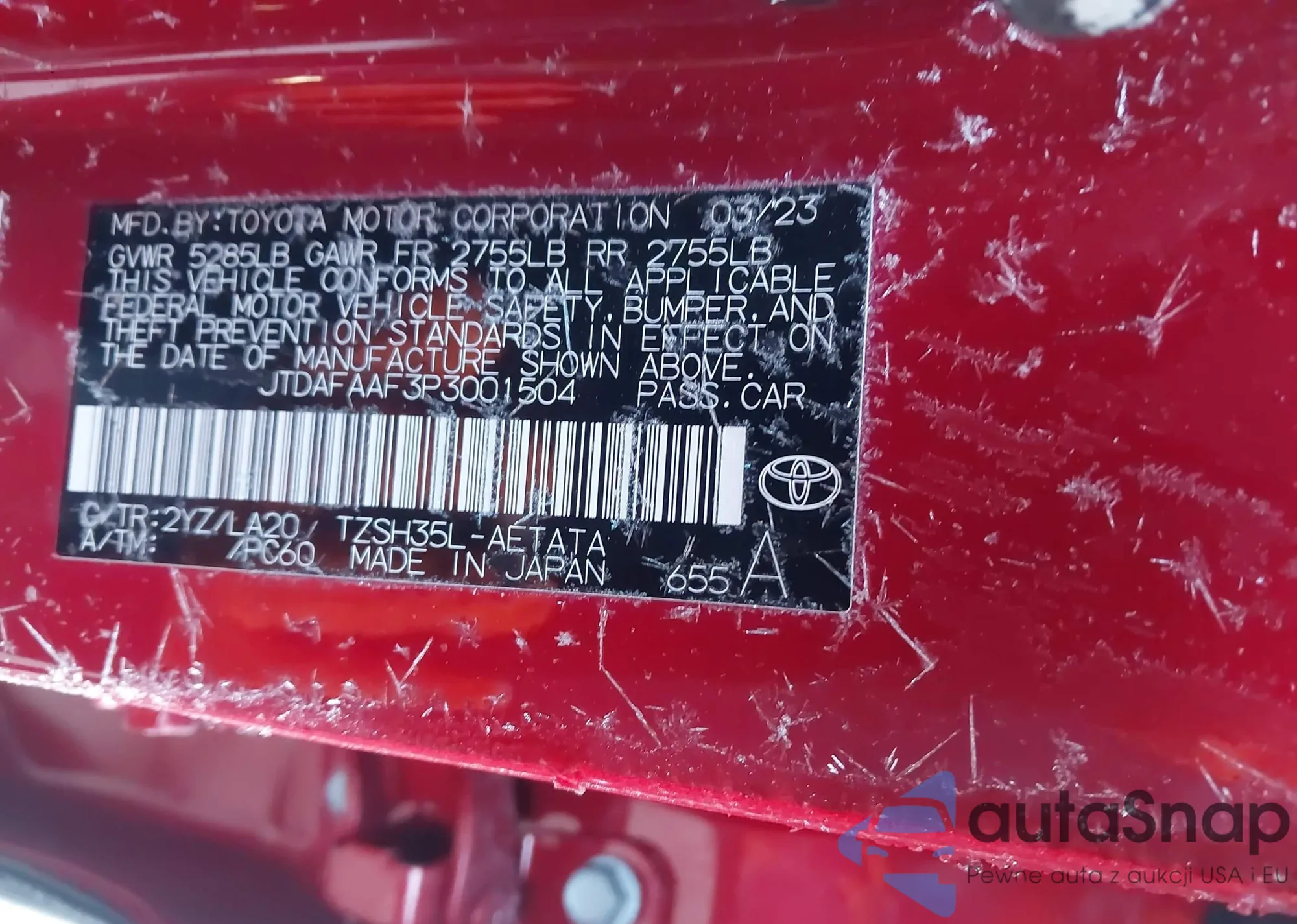 LOT: 44379382 VIN: JTDAFAAF3P3001549