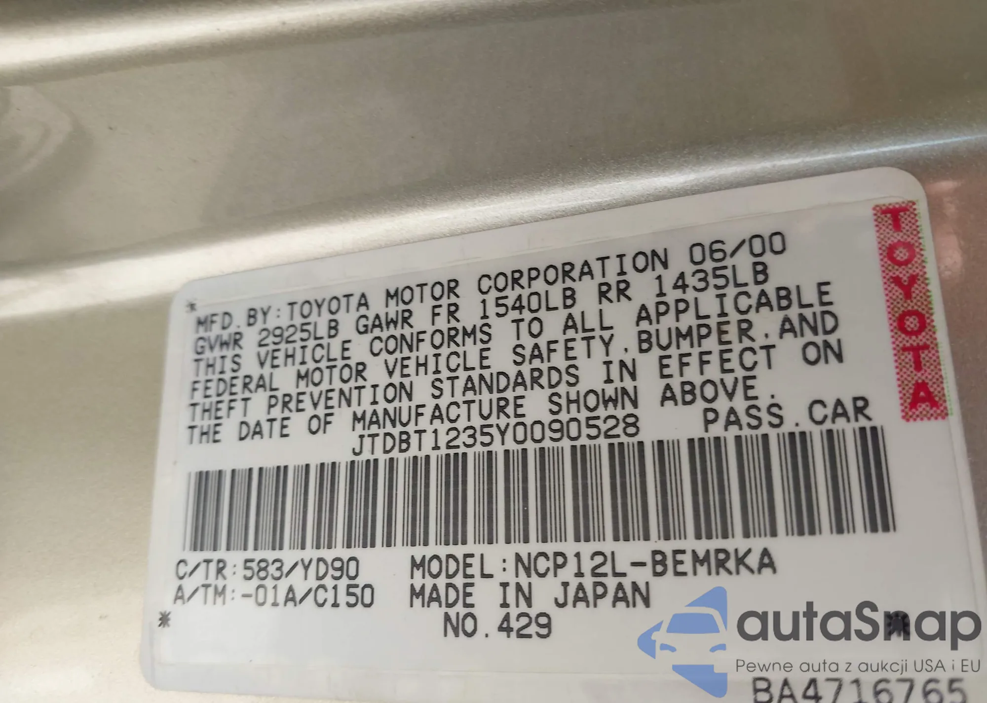 • VIN JTDBT1235Y0090528