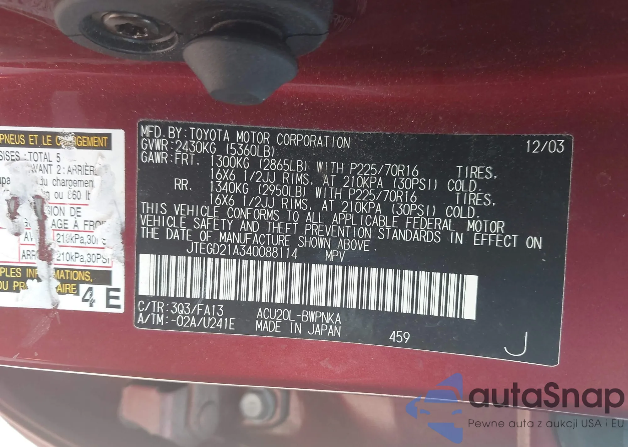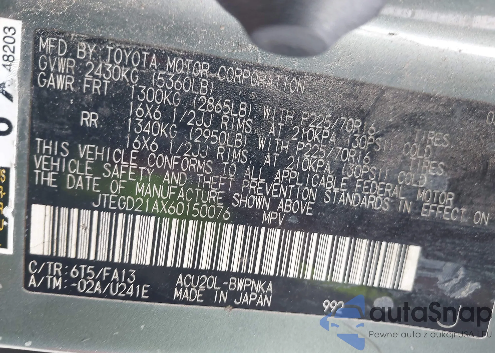 LOT: 75658935 VIN: JTEEW21AX60011910