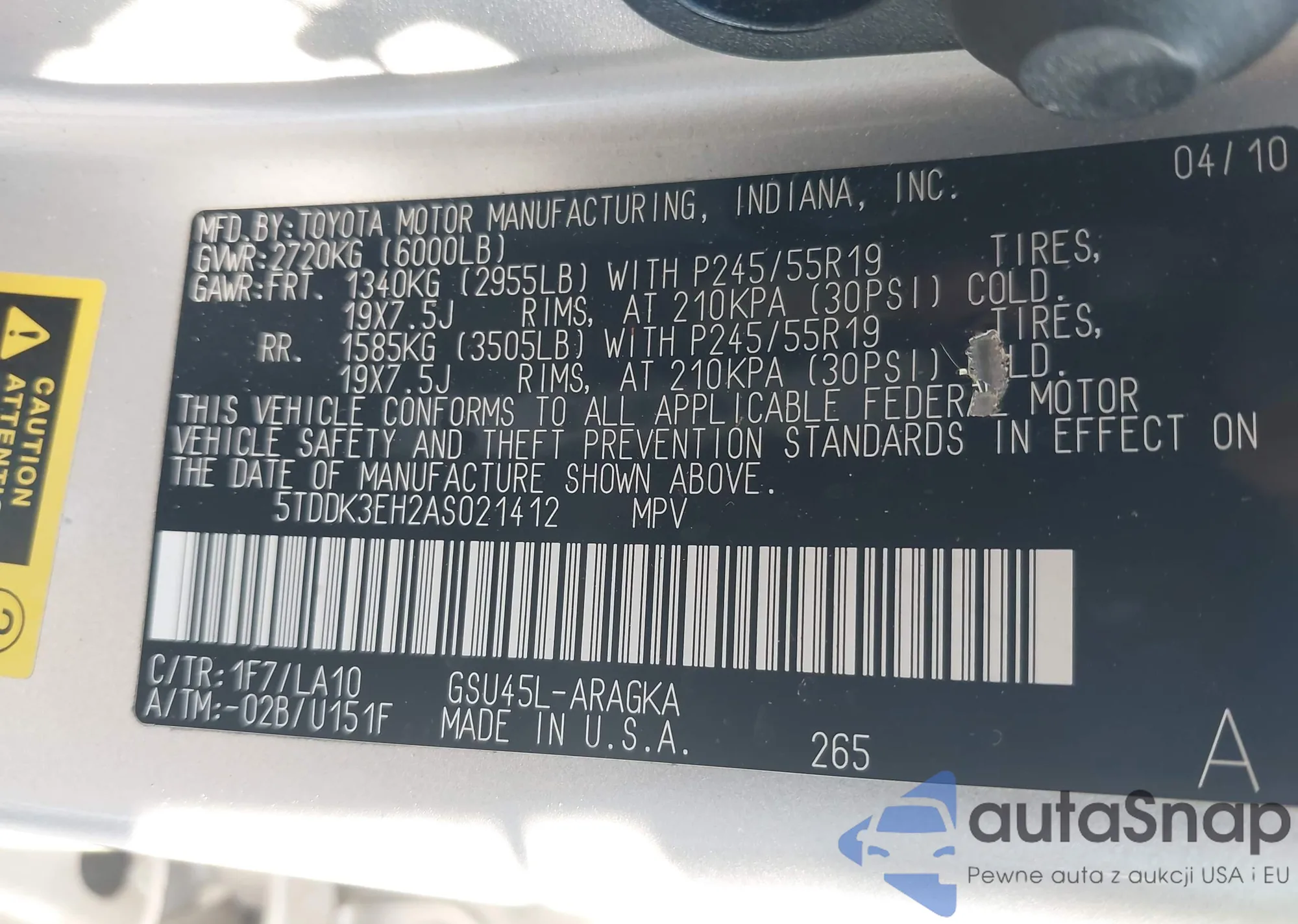 LOT: 44292537 VIN: 5TDDK3EH2AS021412