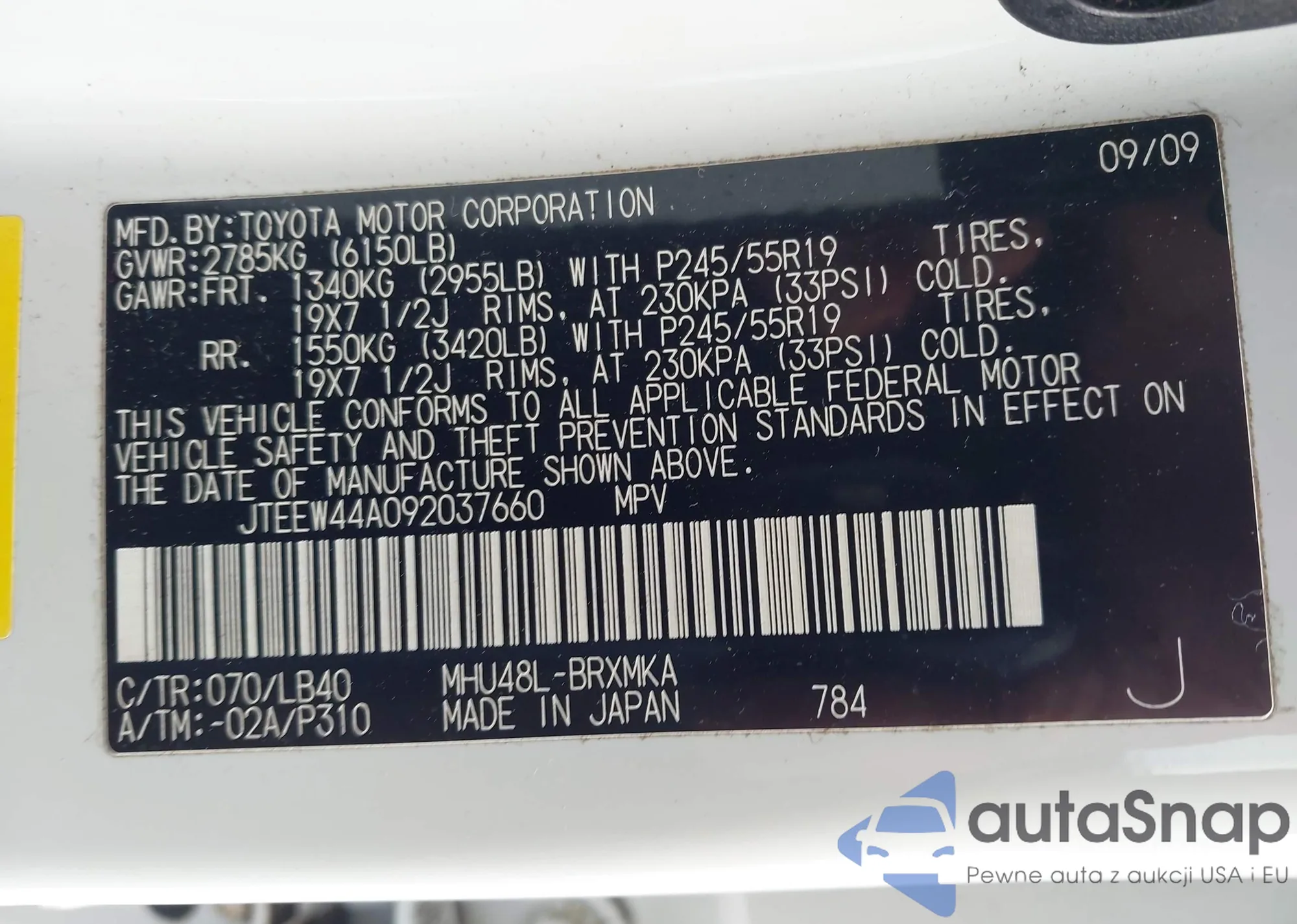 LOT: 44427221 VIN: JTEEW44A092037660