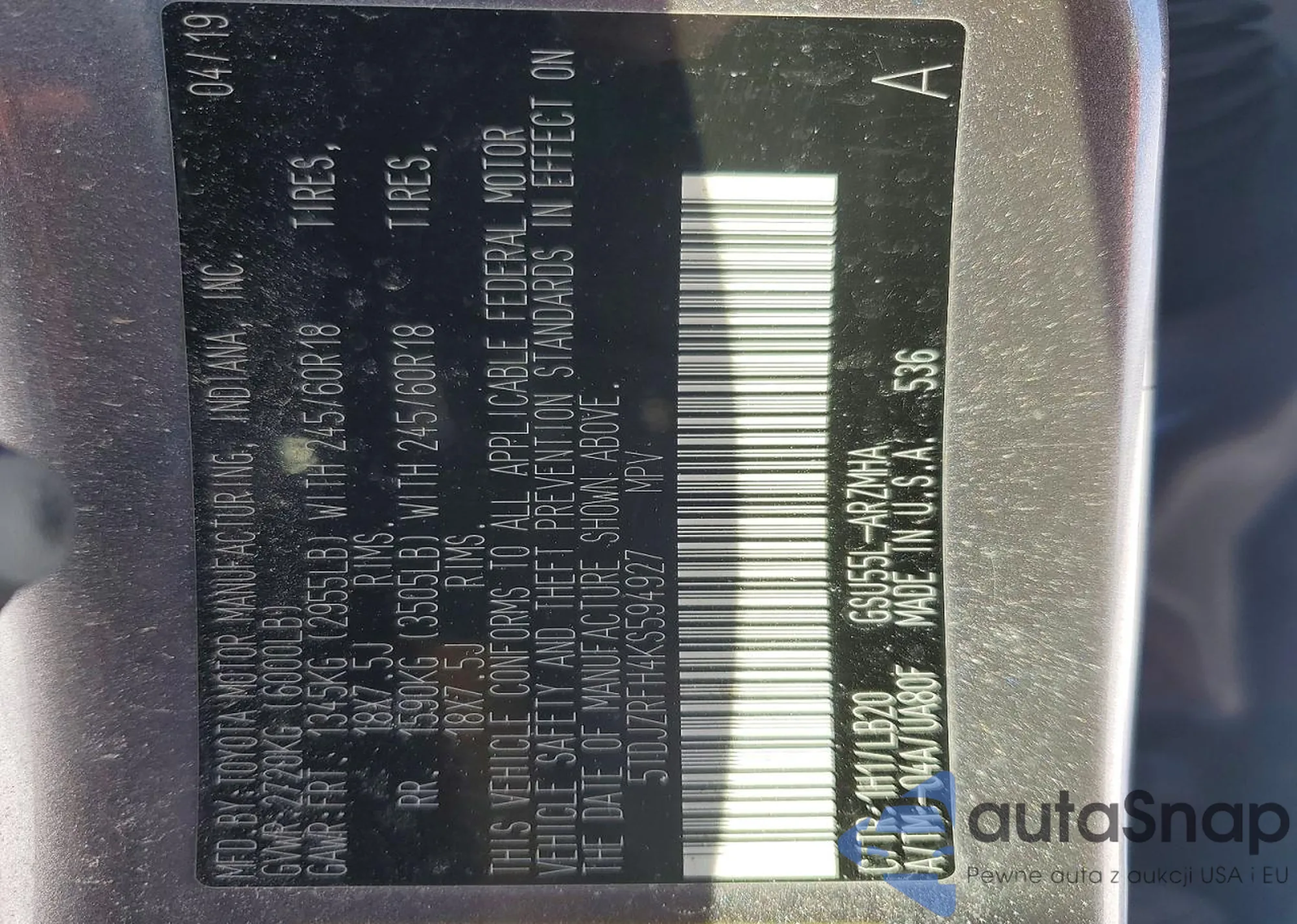 • VIN 5TDJZRFH4KS594927