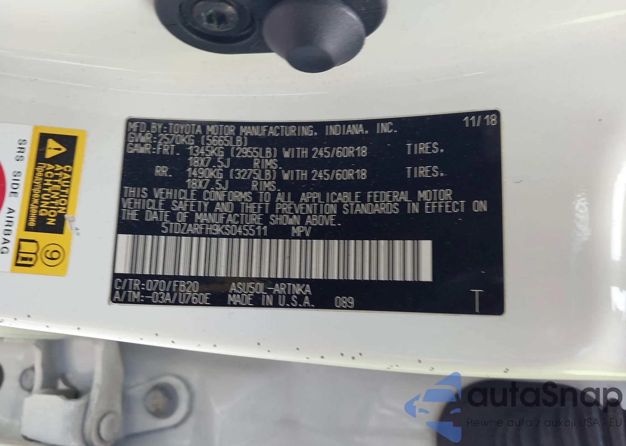 • VIN 5TDZARFH9KS045511