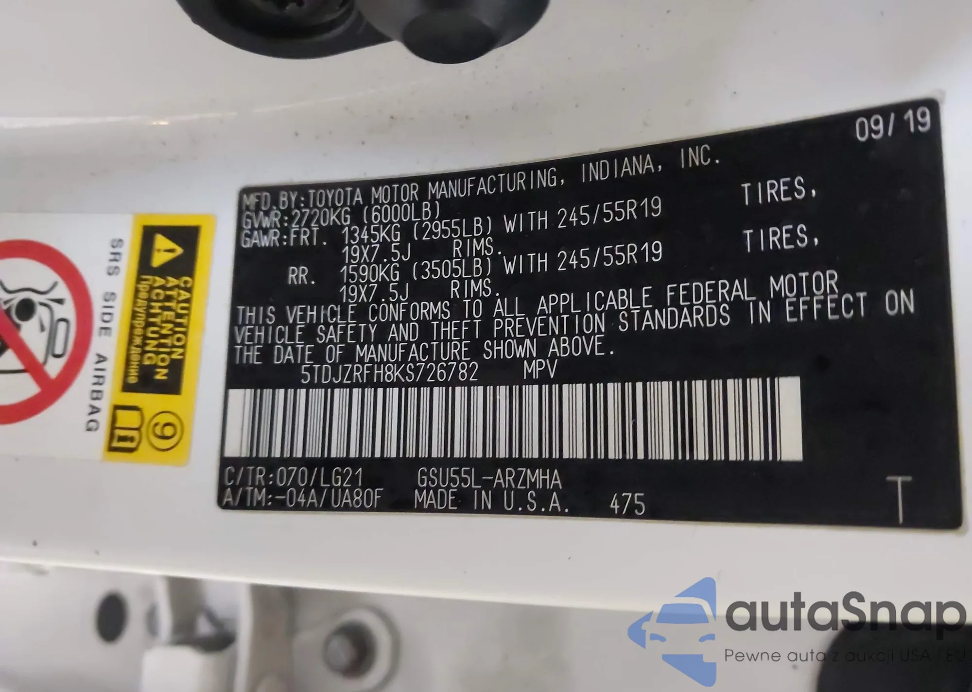LOT: 43731863 VIN: 5TDJZRFH8KS726782