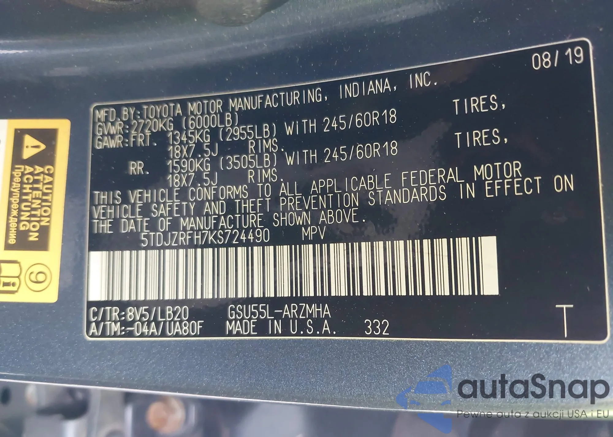 • VIN 5TDJZRFH7KS724490