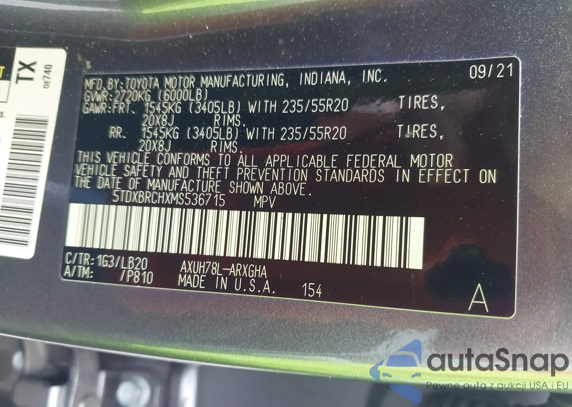 • VIN 5TDXBRCHXMS536715