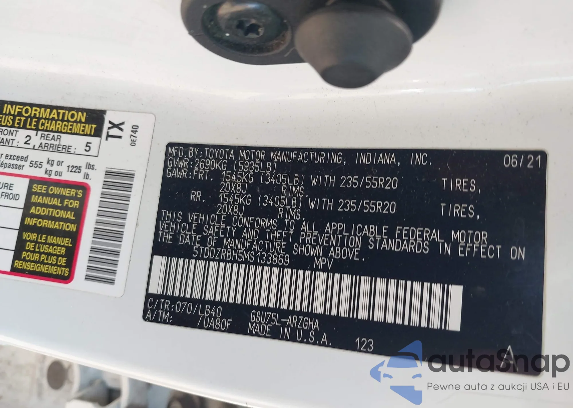 LOT: 43760688 VIN: 5TDDZRBH5MS133869