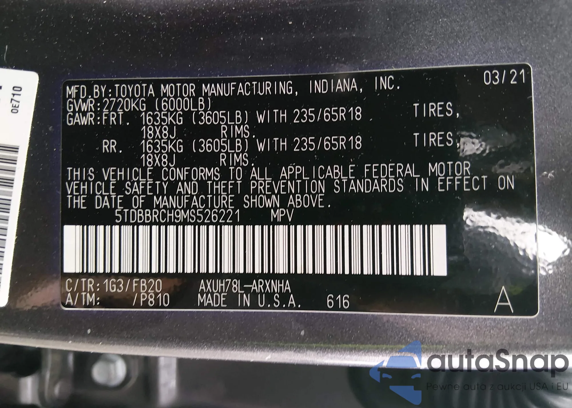 LOT: 44403637 VIN: 5TDBBRCH9MS526221