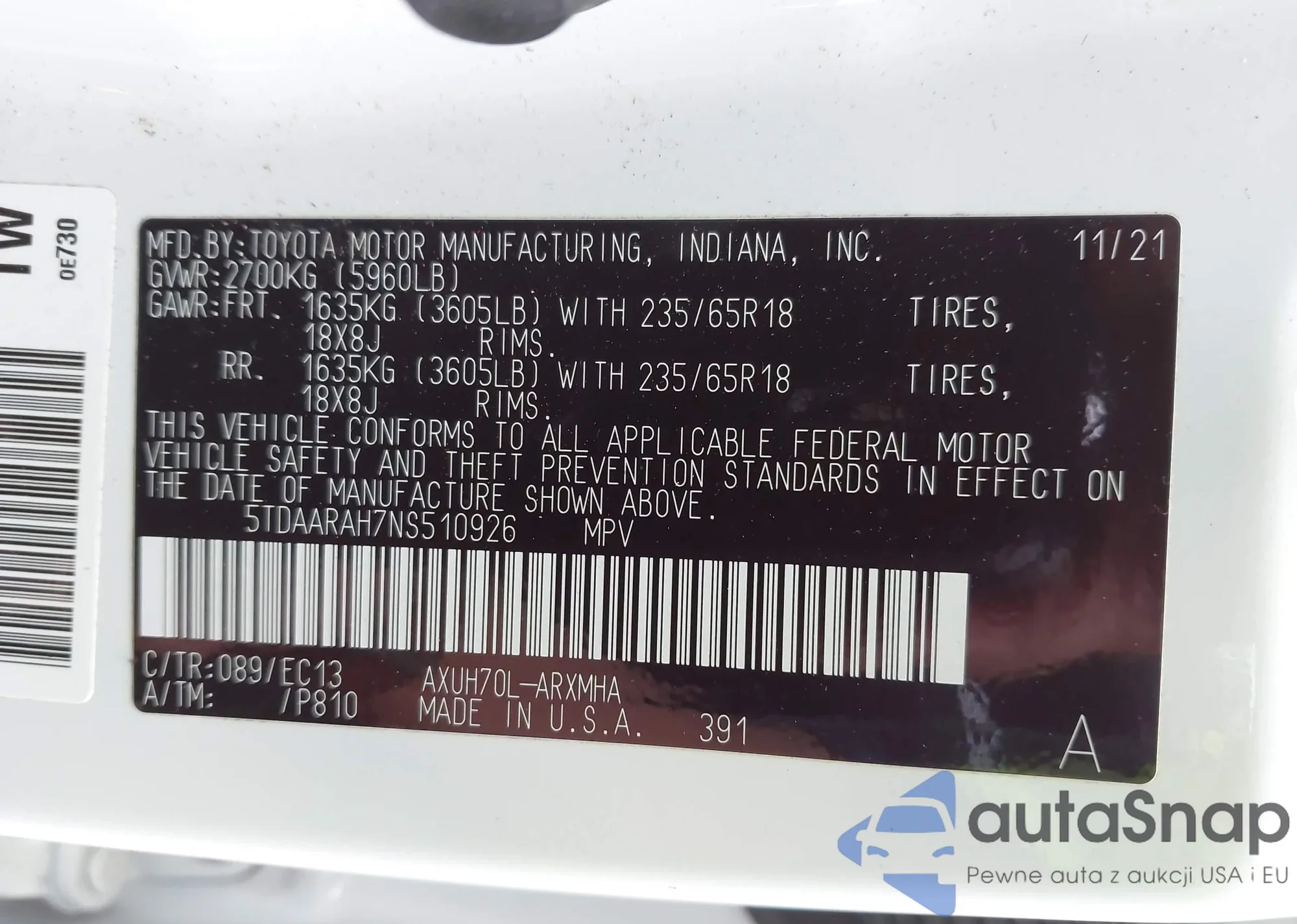 • VIN 5TDAARAH7NS510926