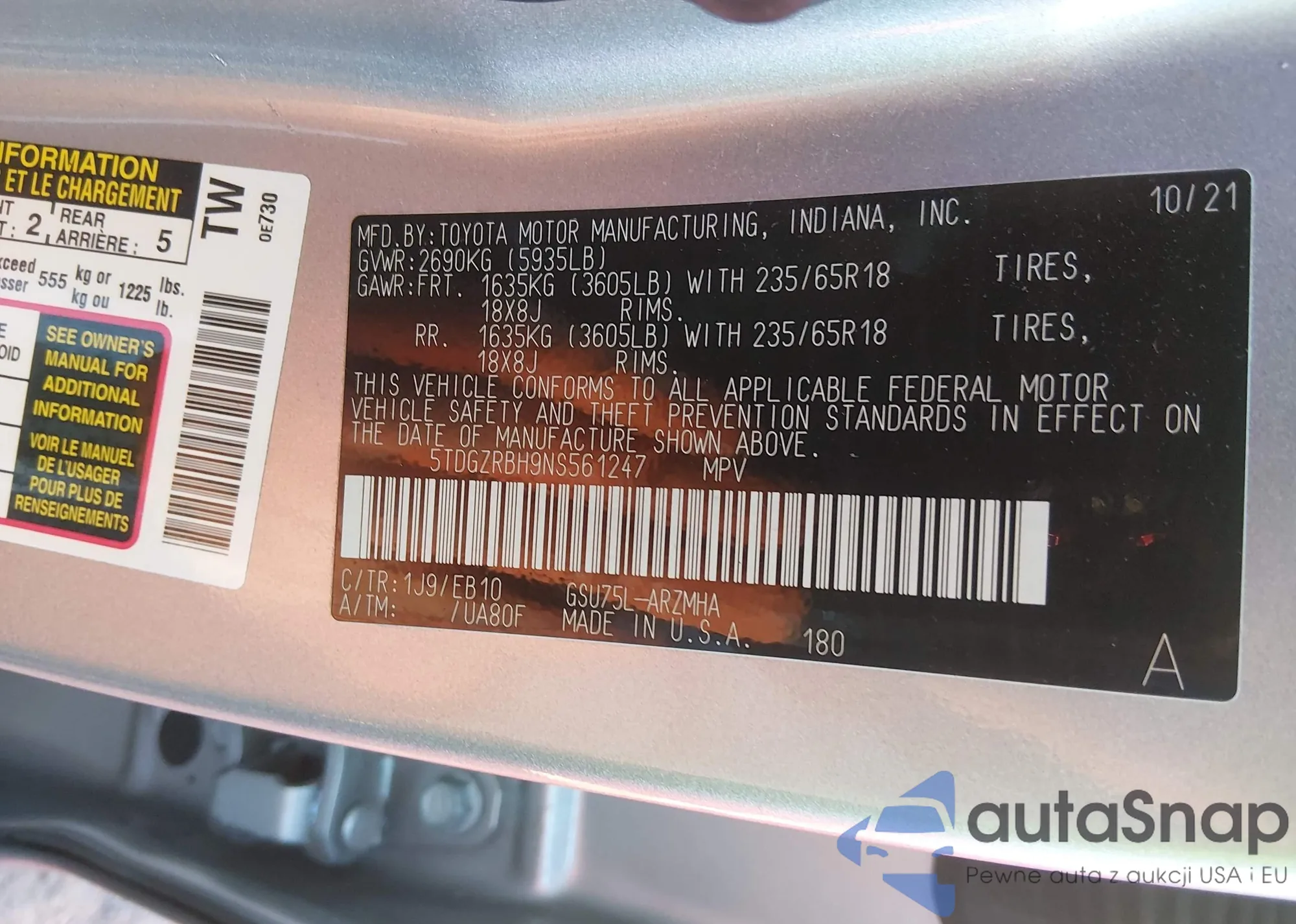 LOT: 44420103 VIN: 5TDGZRBH9NS561247
