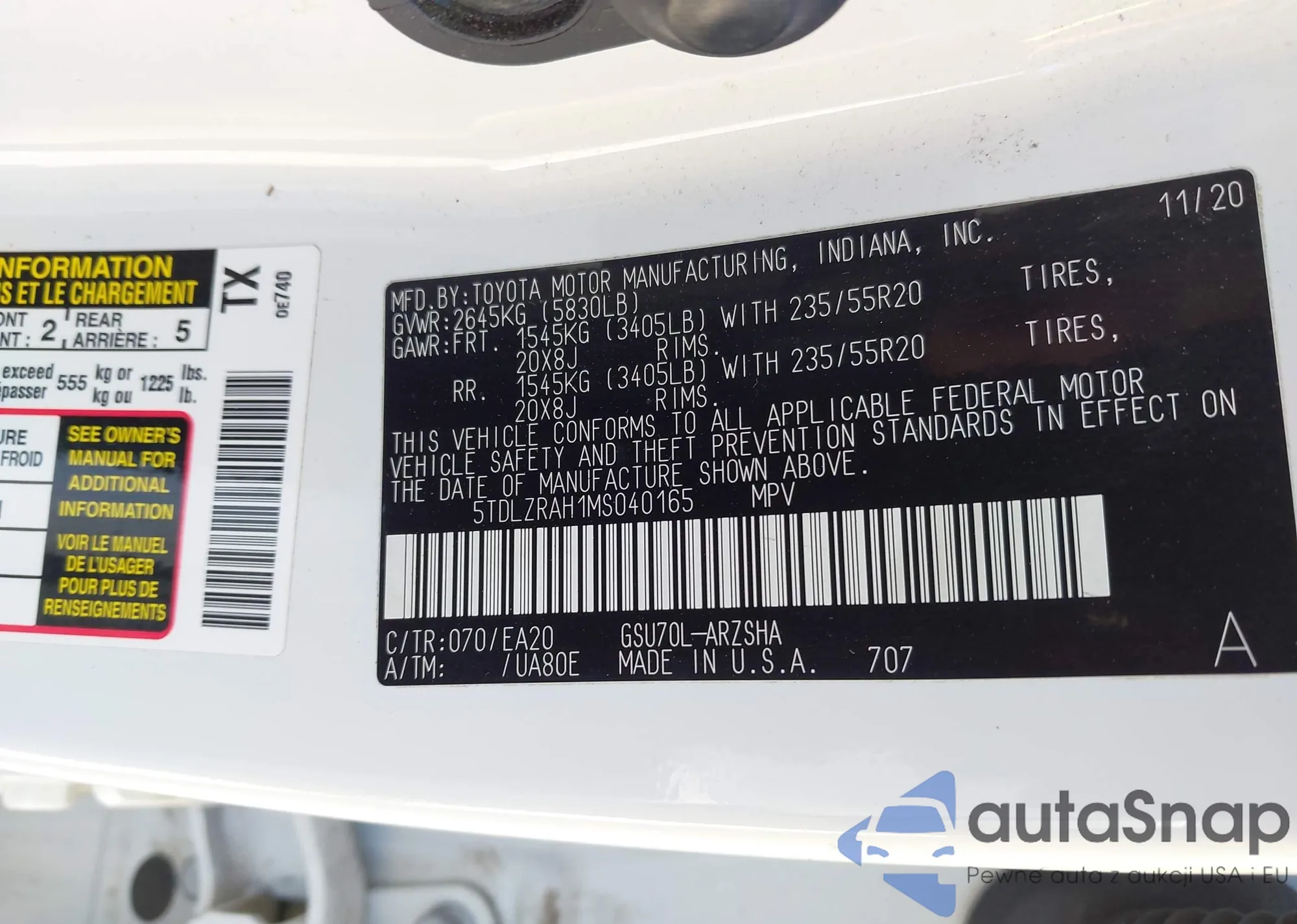 LOT: 44455207 VIN: 5TDLZRAH1MS040165