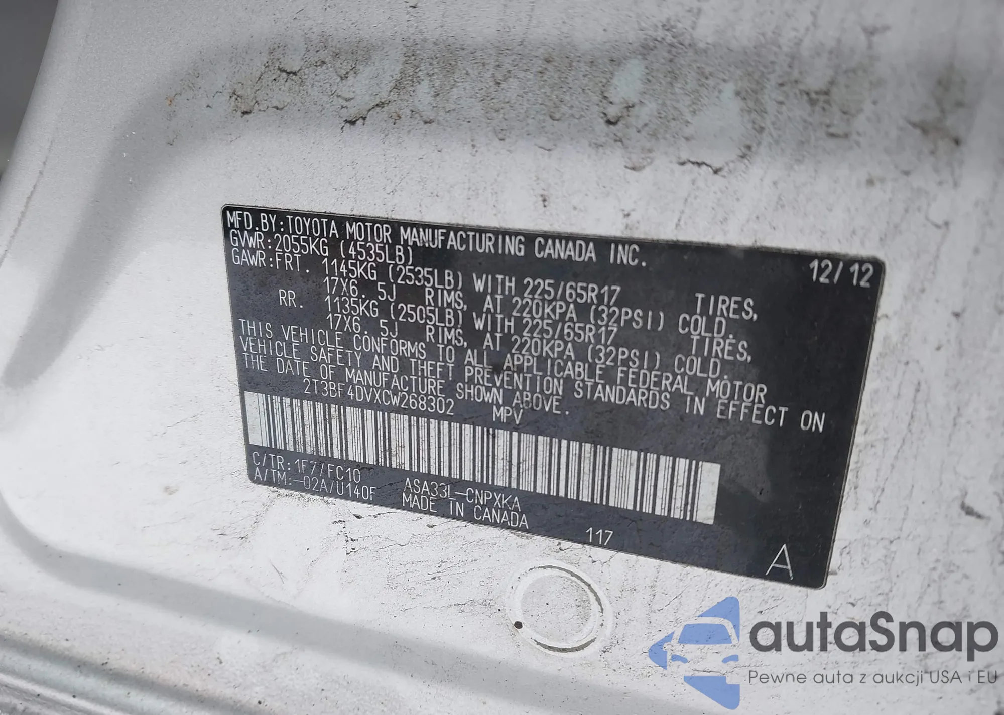 LOT: 44160118 VIN: 2T3BF4DVXCW268302