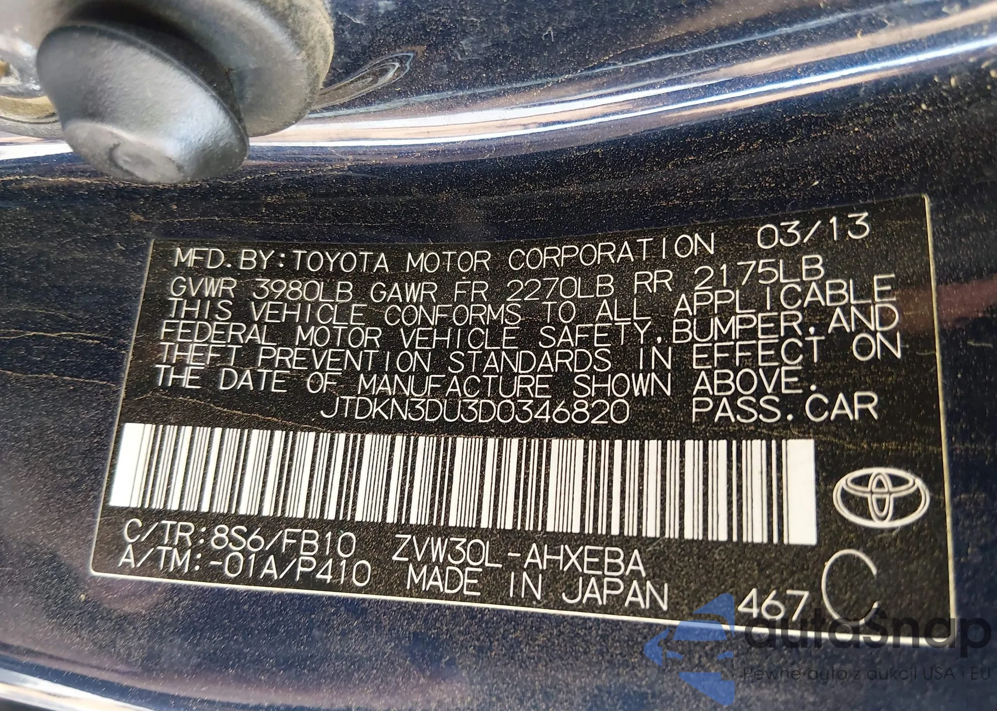 LOT: 44454802 VIN: JTDKN3DU3D0346820