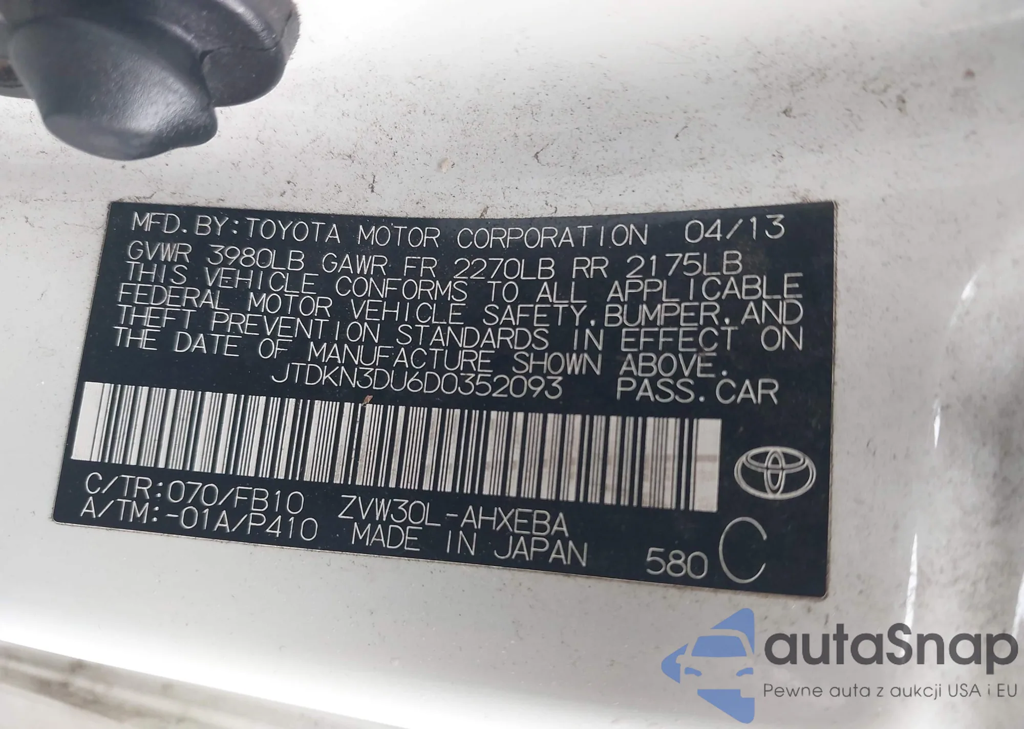 LOT: 44305485 VIN: JTDKN3DU0D0349433