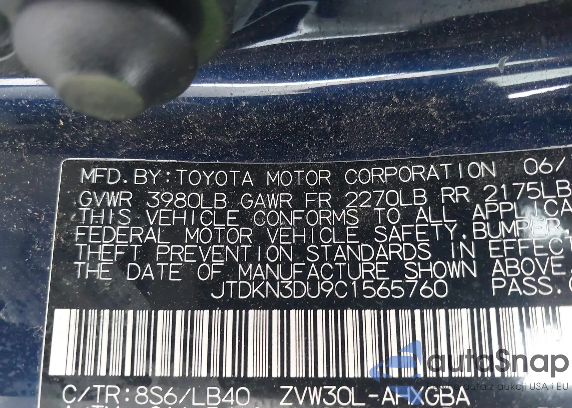 LOT: 44385232 VIN: JTDKN3DU9C1565760