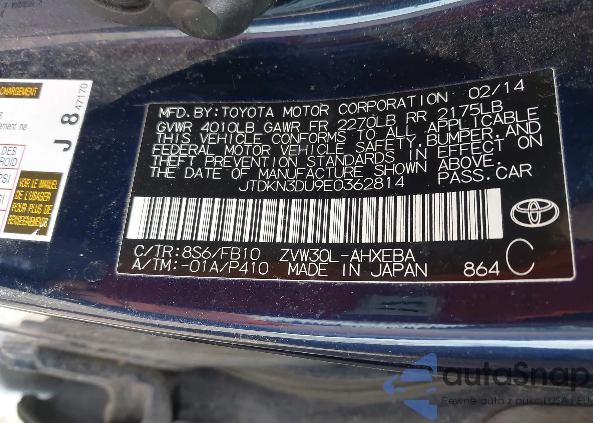 LOT: 44487012 VIN: JTDKN3DU9E0362814