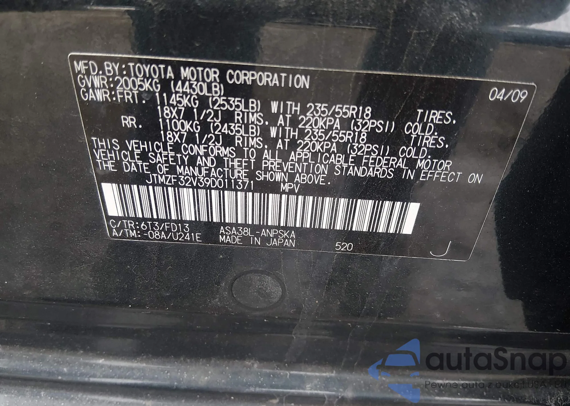 LOT: 44272257 VIN: JTMZF32V29D010518