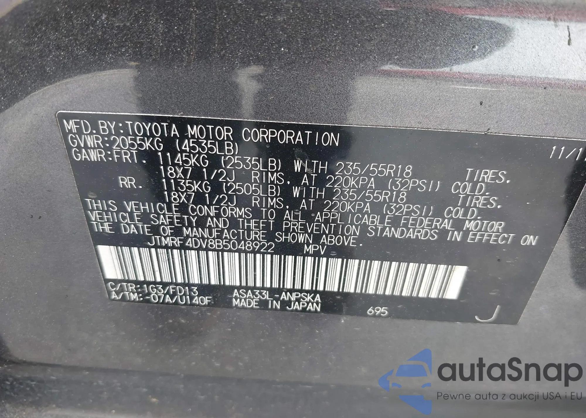LOT: 42392842 VIN: JTMRF4DV8B5048922