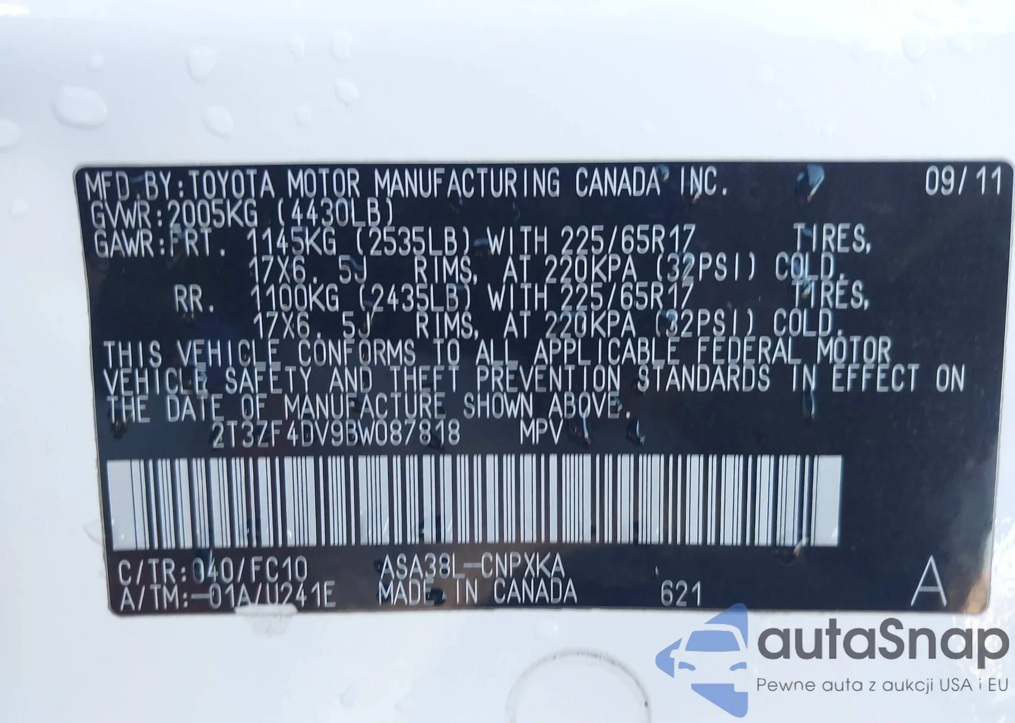 • VIN 2T3ZF4DV9BW087818