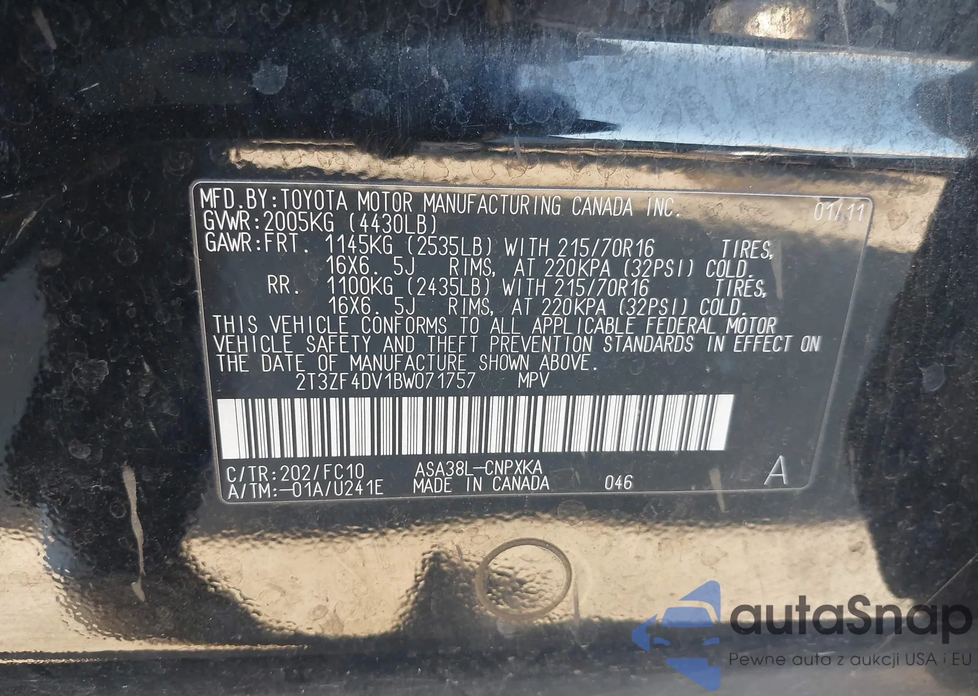 LOT: 44175679 VIN: 2T3ZF4DV1BW071757