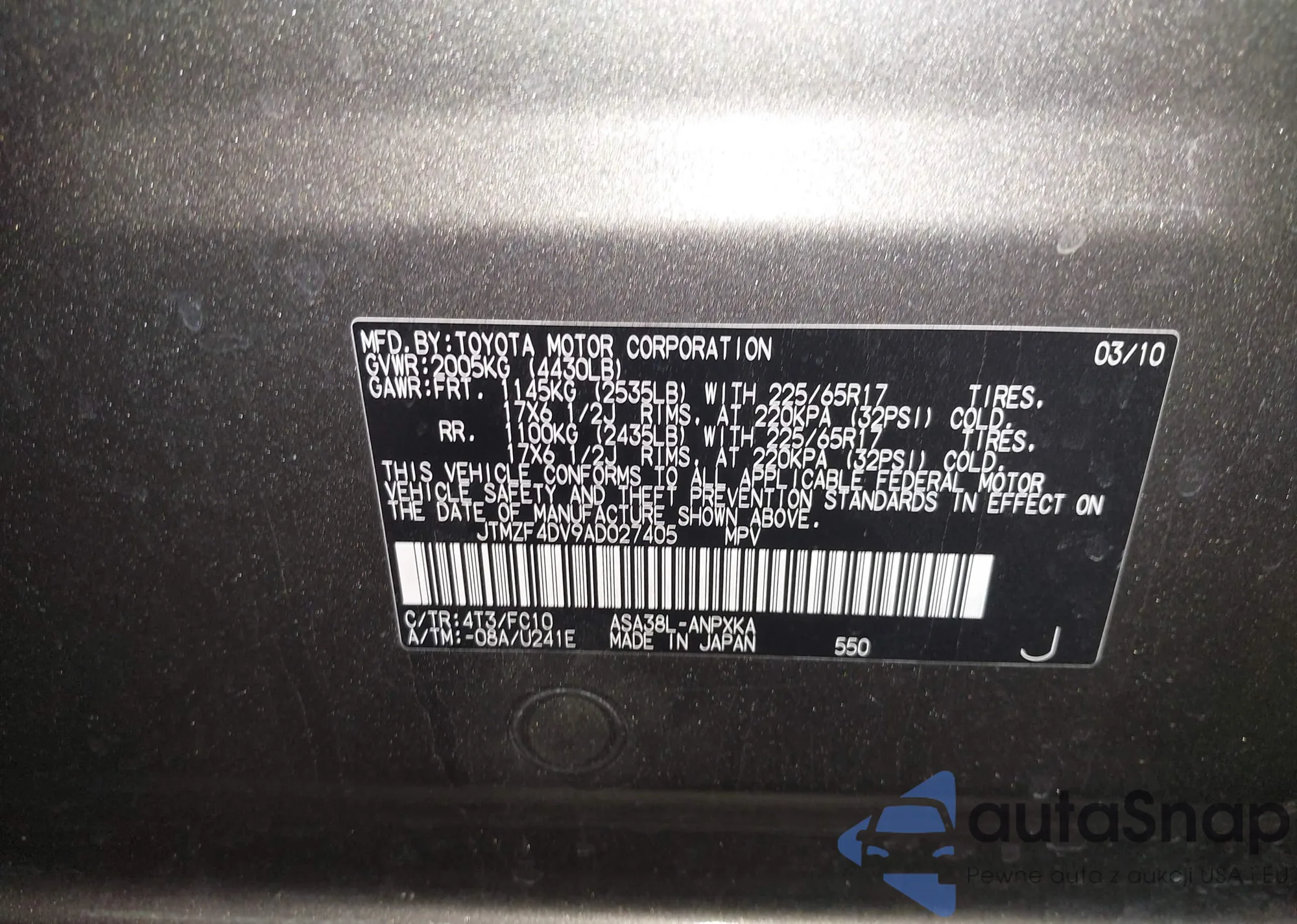 LOT: 44184343 VIN: JTMZF4DV9AD027405