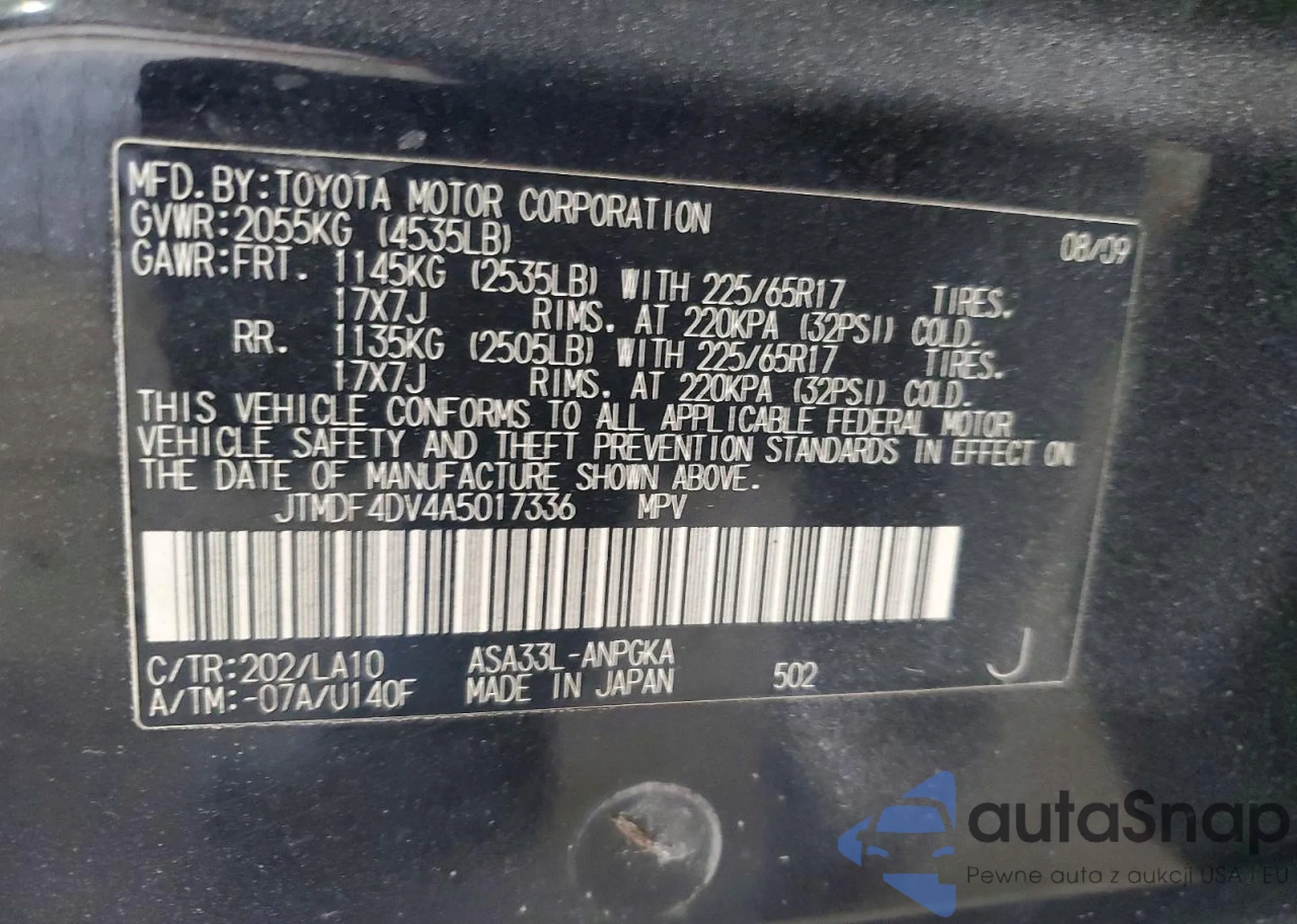 • VIN JTMDF4DV4A5017336