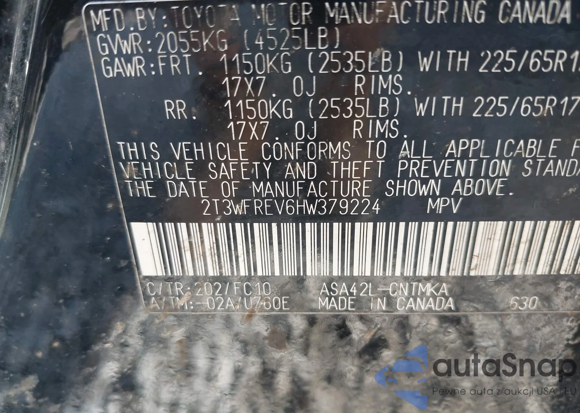 • VIN 2T3WFREV6HW379224