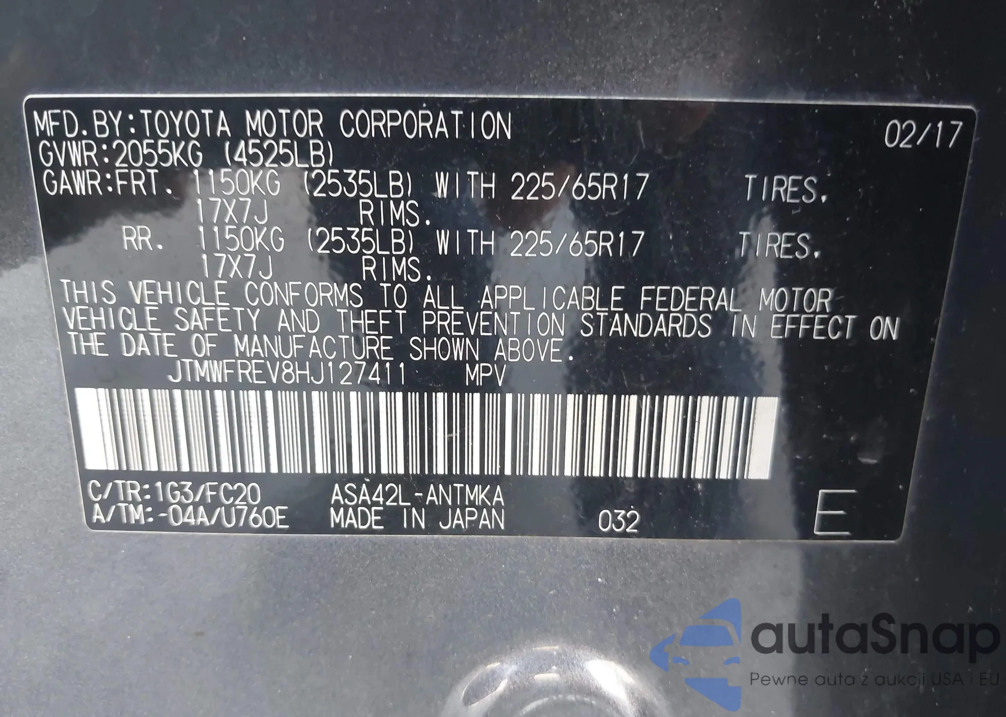 LOT: 42065431 VIN: JTMRJREV2HD136275