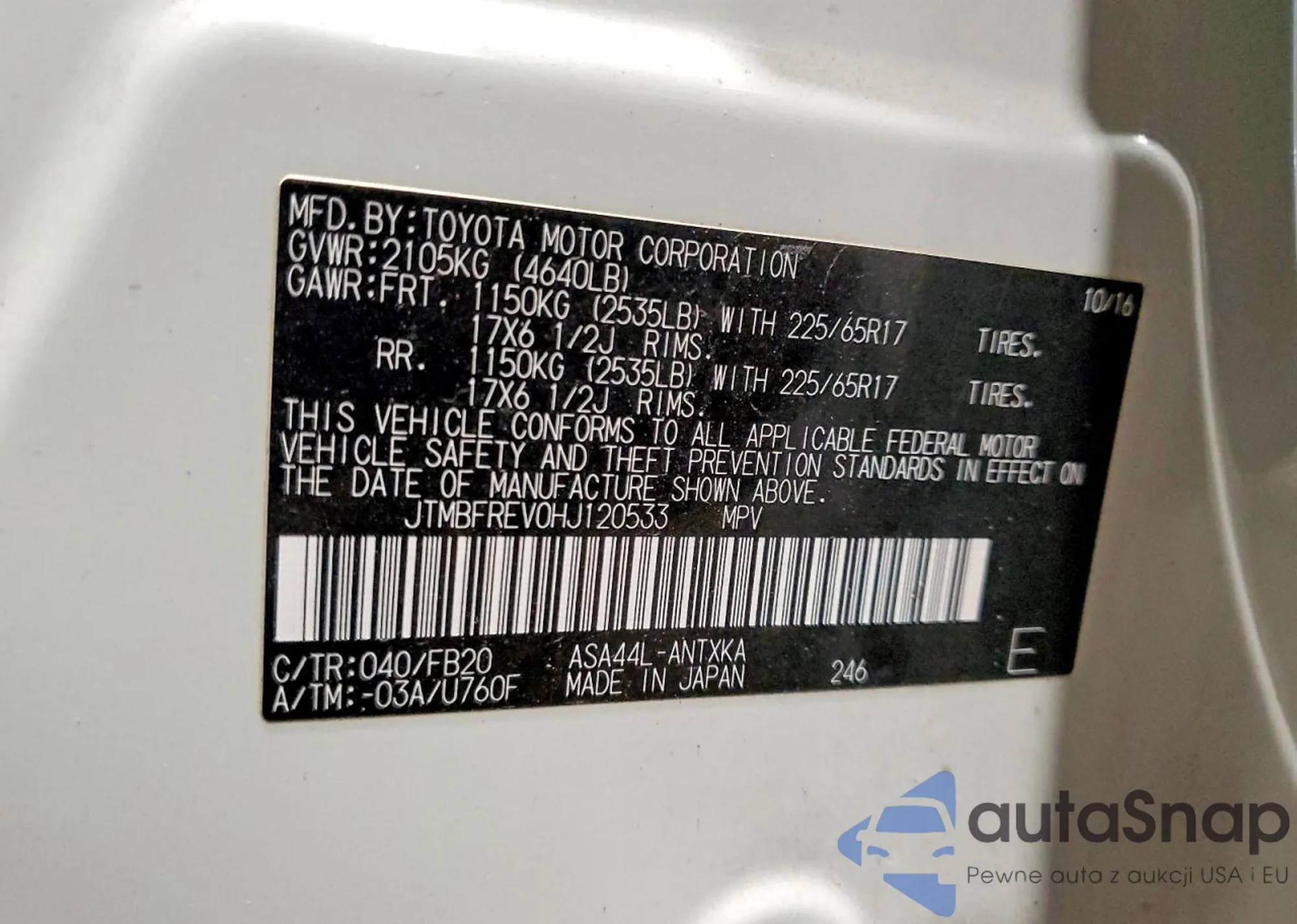 LOT: 76878905 VIN: JTMRFREV2HJ161048