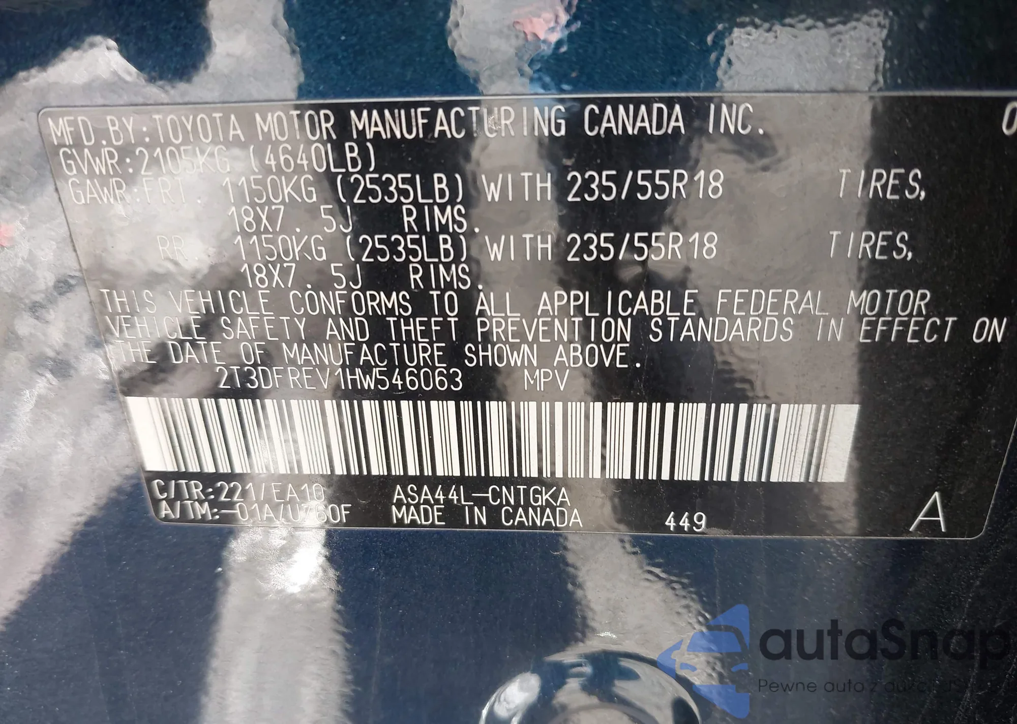 • VIN 2T3DFREV1HW546063