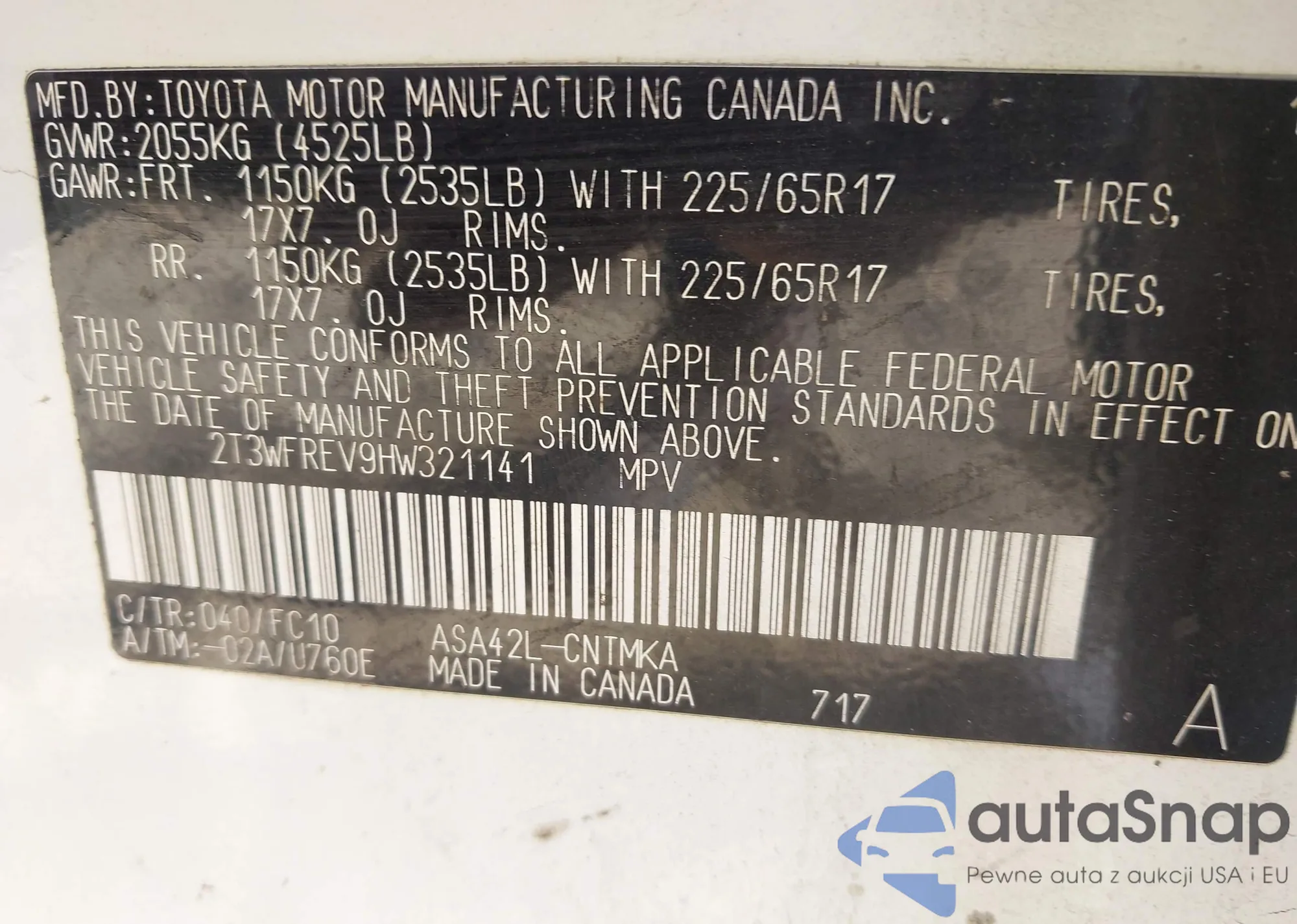 LOT: 44444149 VIN: 2T3WFREV9HW321141