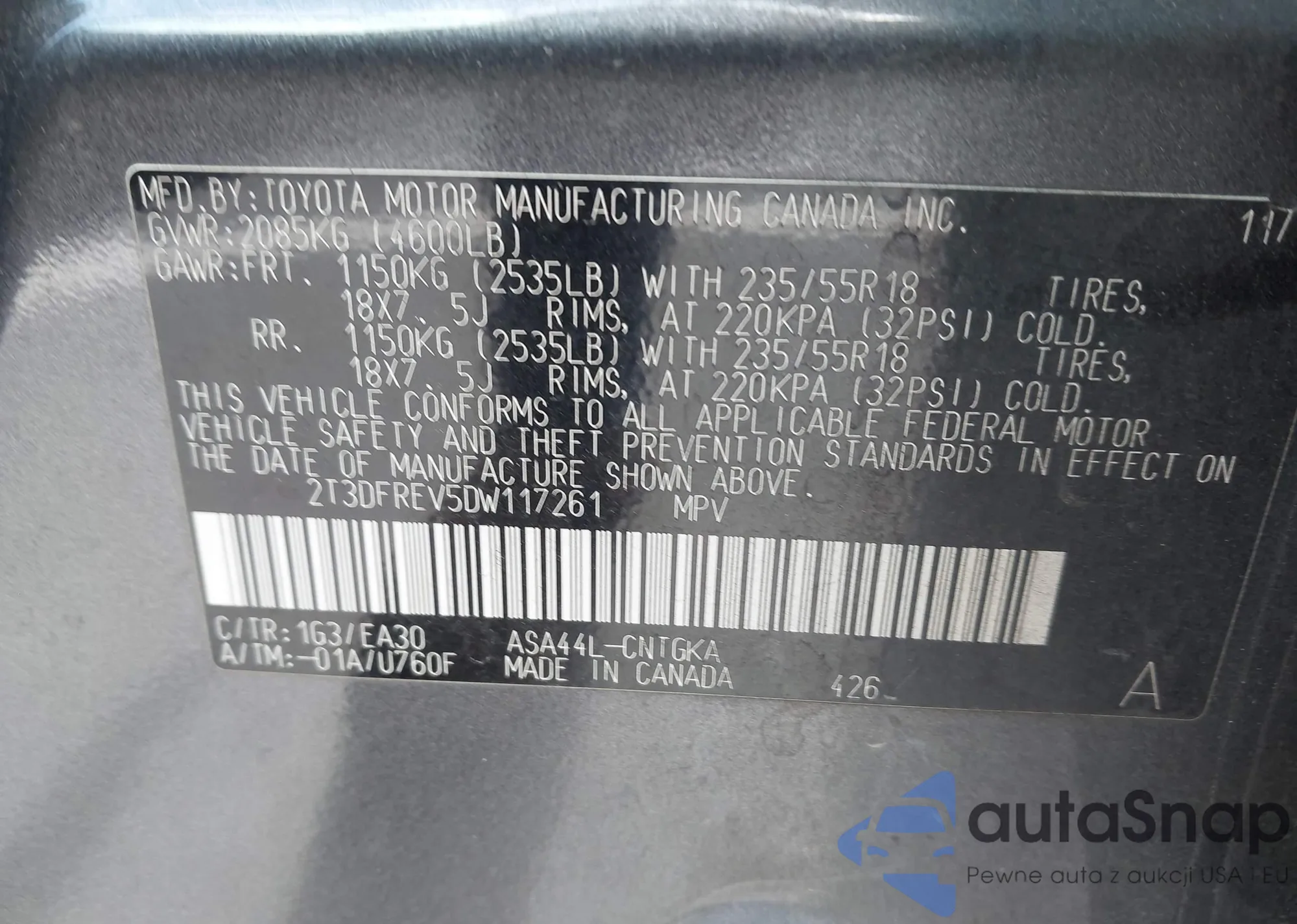 • VIN 2T3DFREV5DW117261