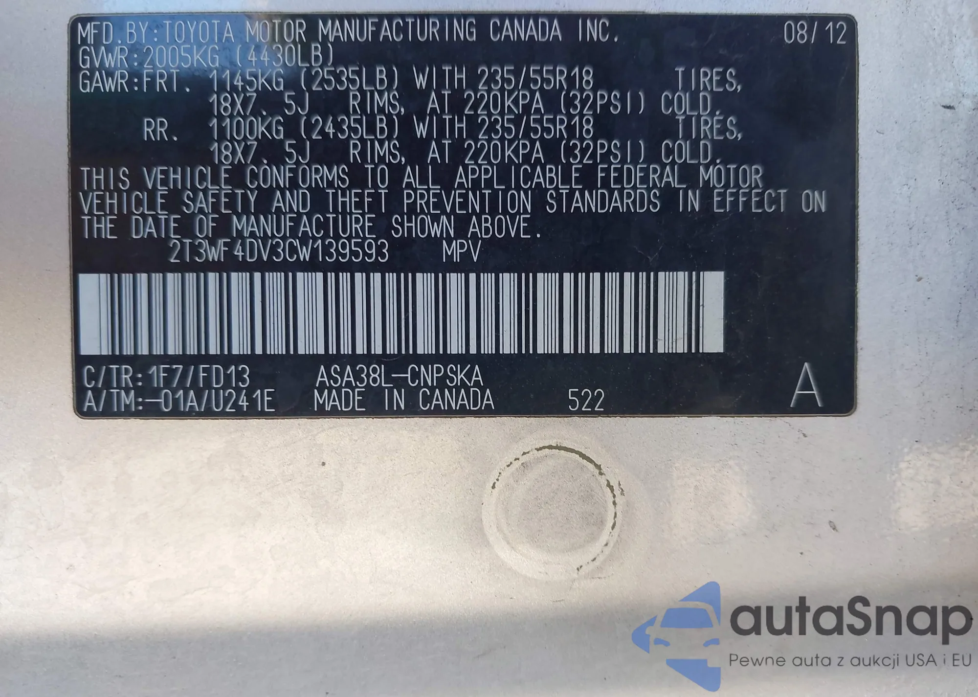 • VIN 2T3WF4DV3CW139593