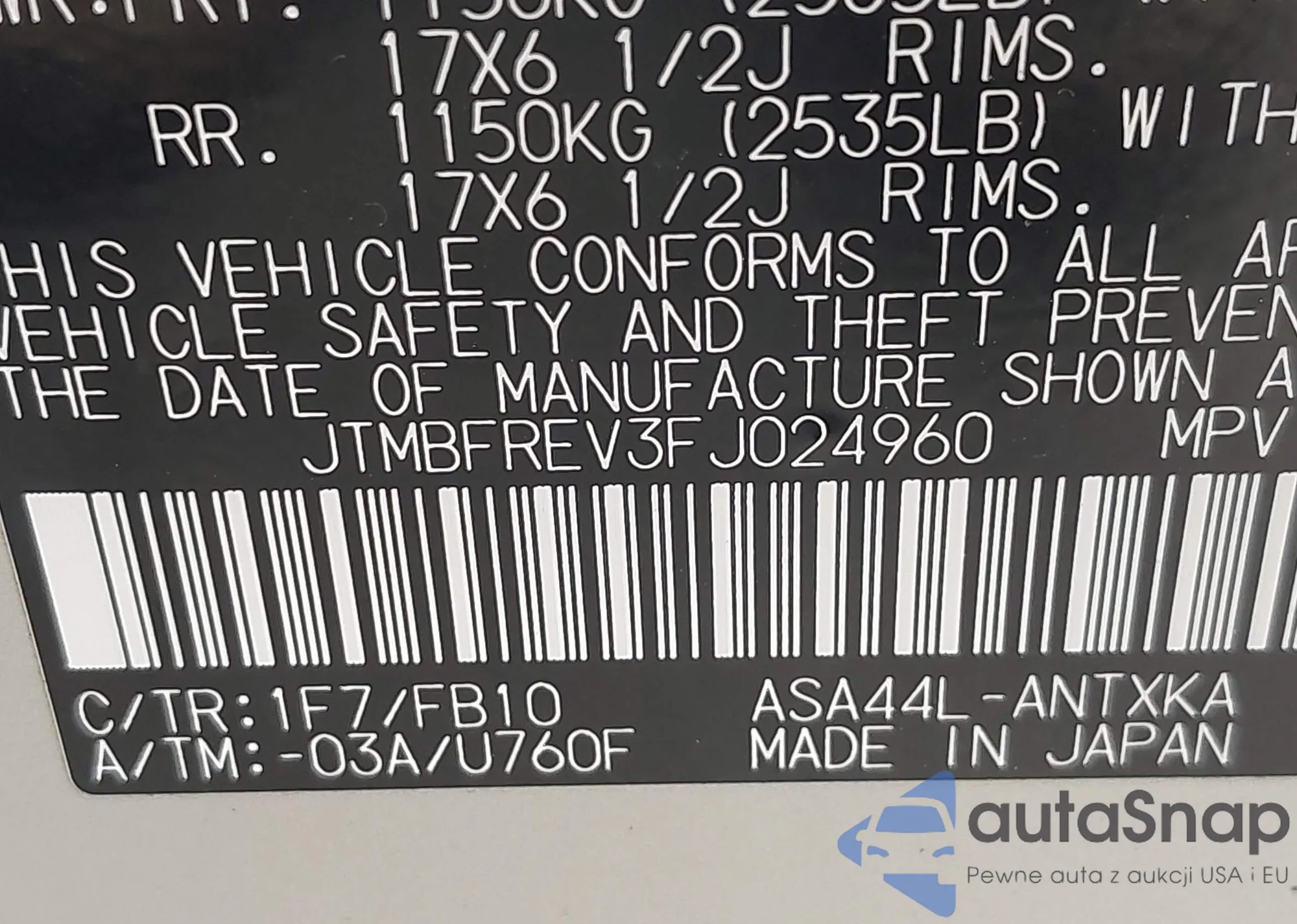 LOT: 42112077 VIN: JTMBFREV3FJ024960