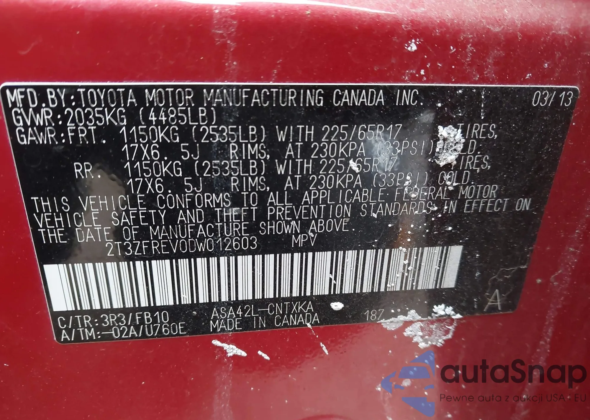 • VIN 2T3ZFREV0DW012603