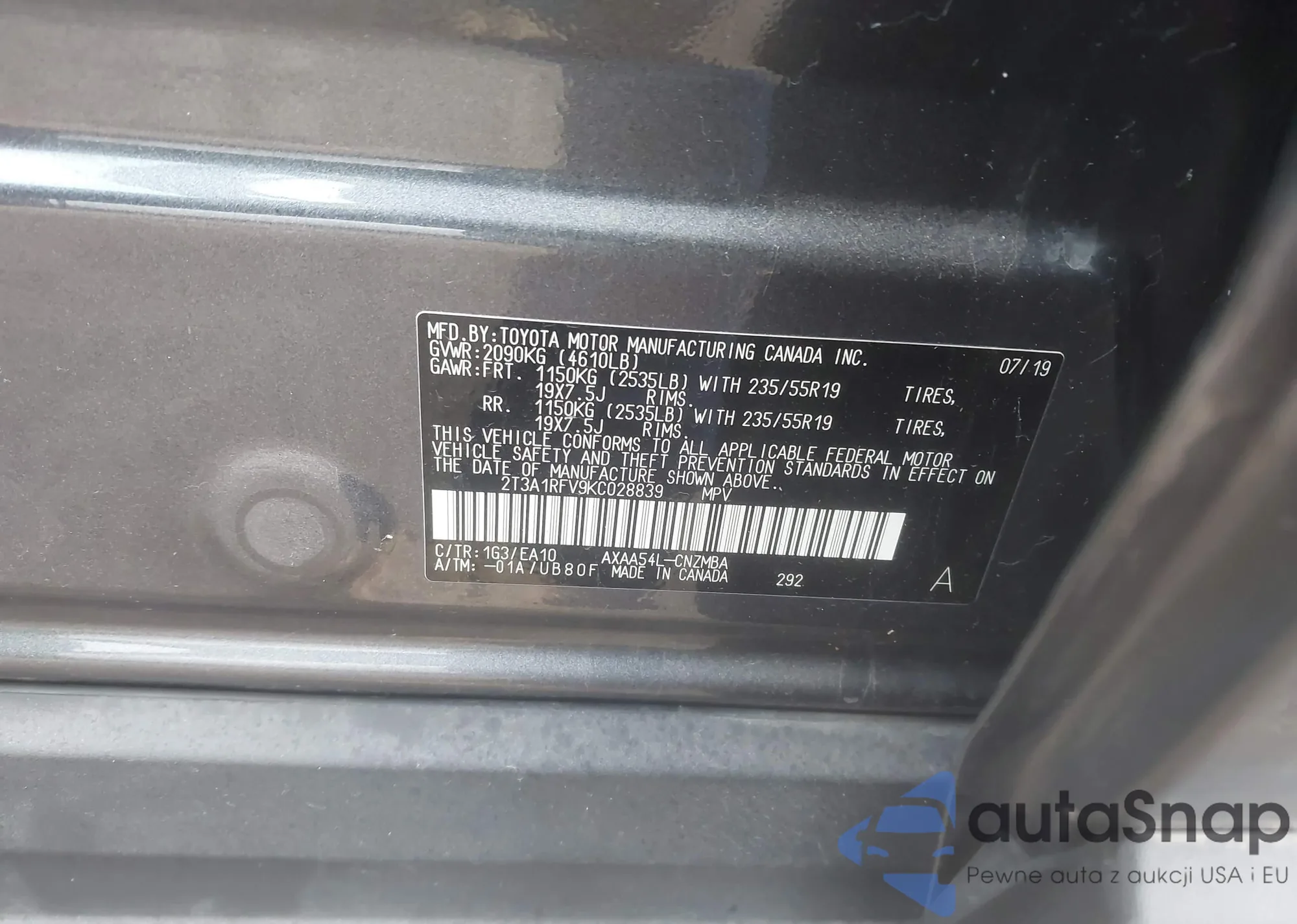LOT: 43879699 VIN: 2T3A1RFV9KC028839