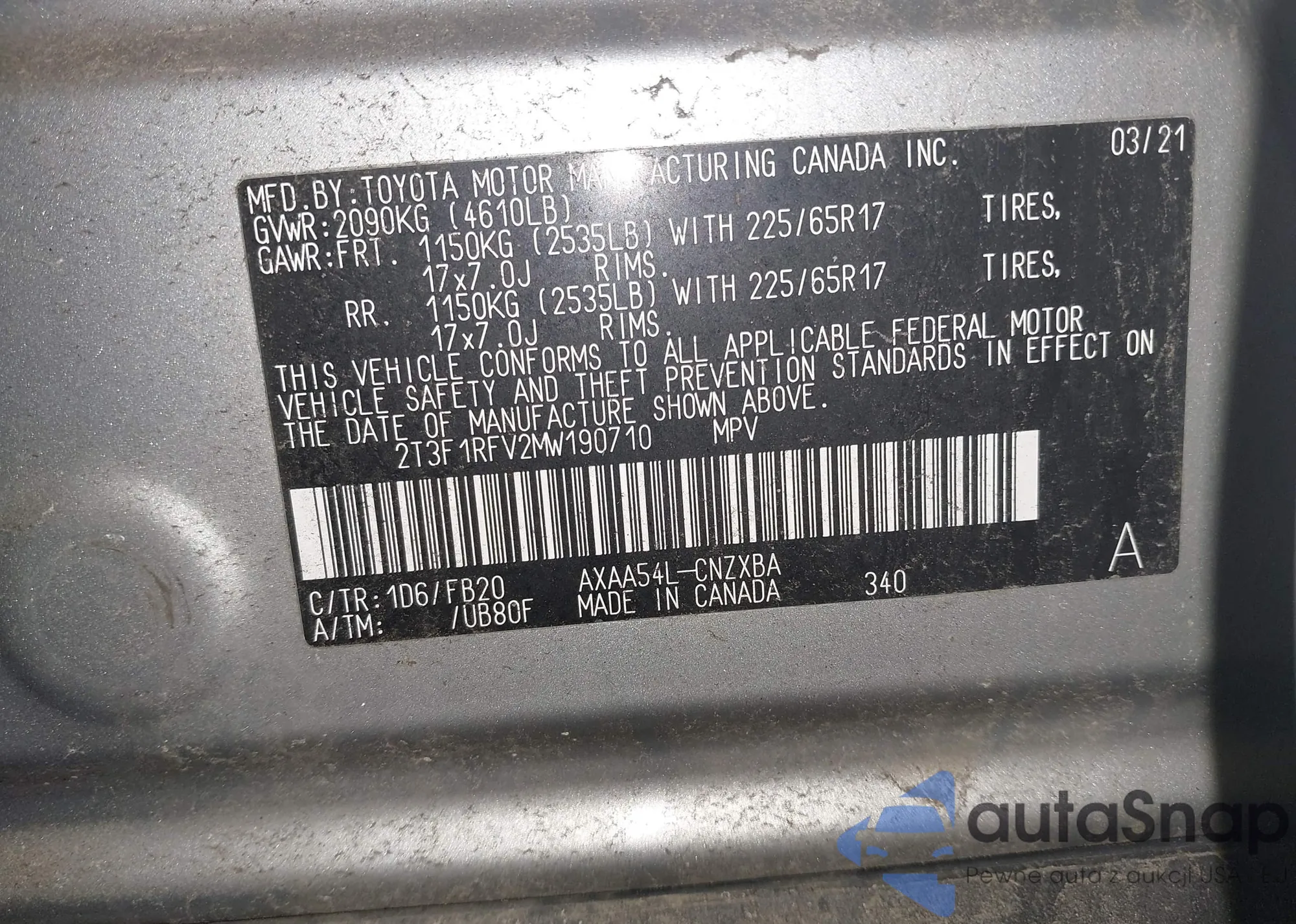 LOT: 44246114 VIN: 2T3F1RFV2MW190710