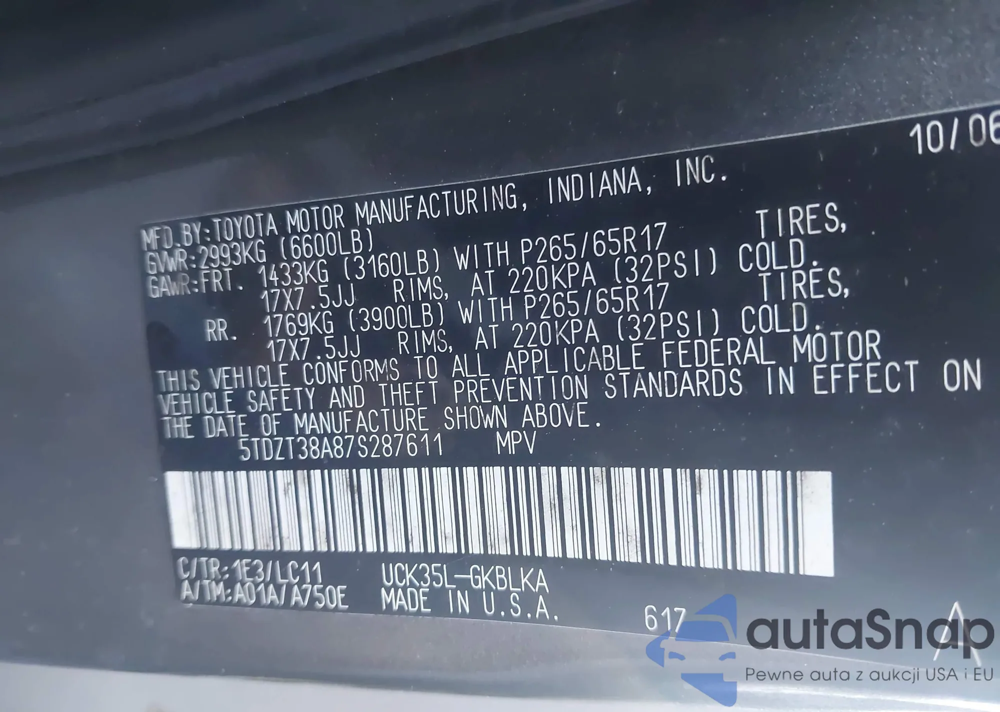 LOT: 44403712 VIN: 5TDZT38A87S287611
