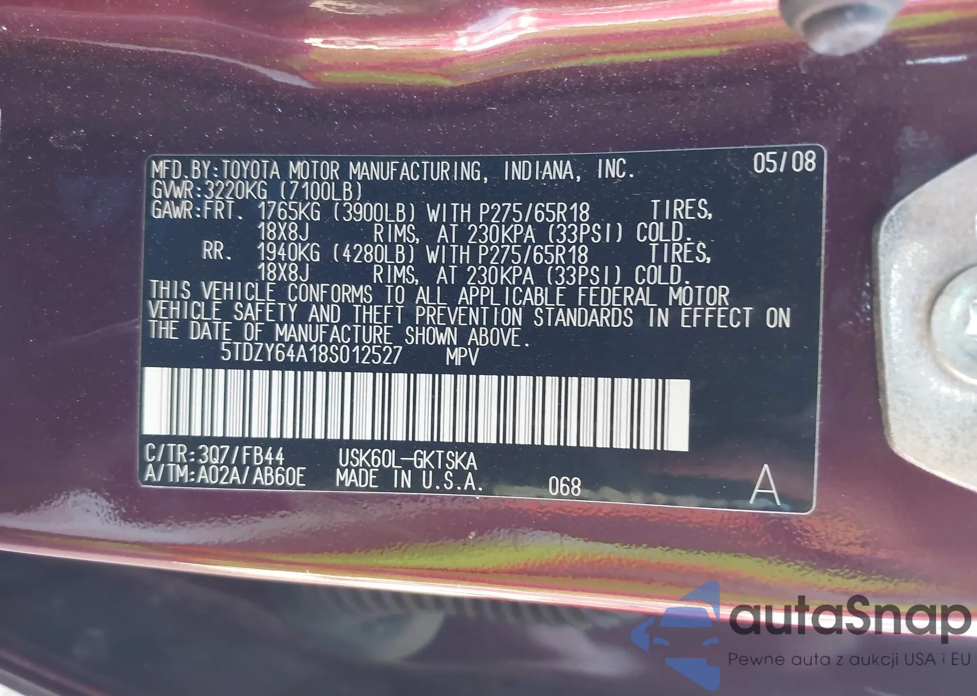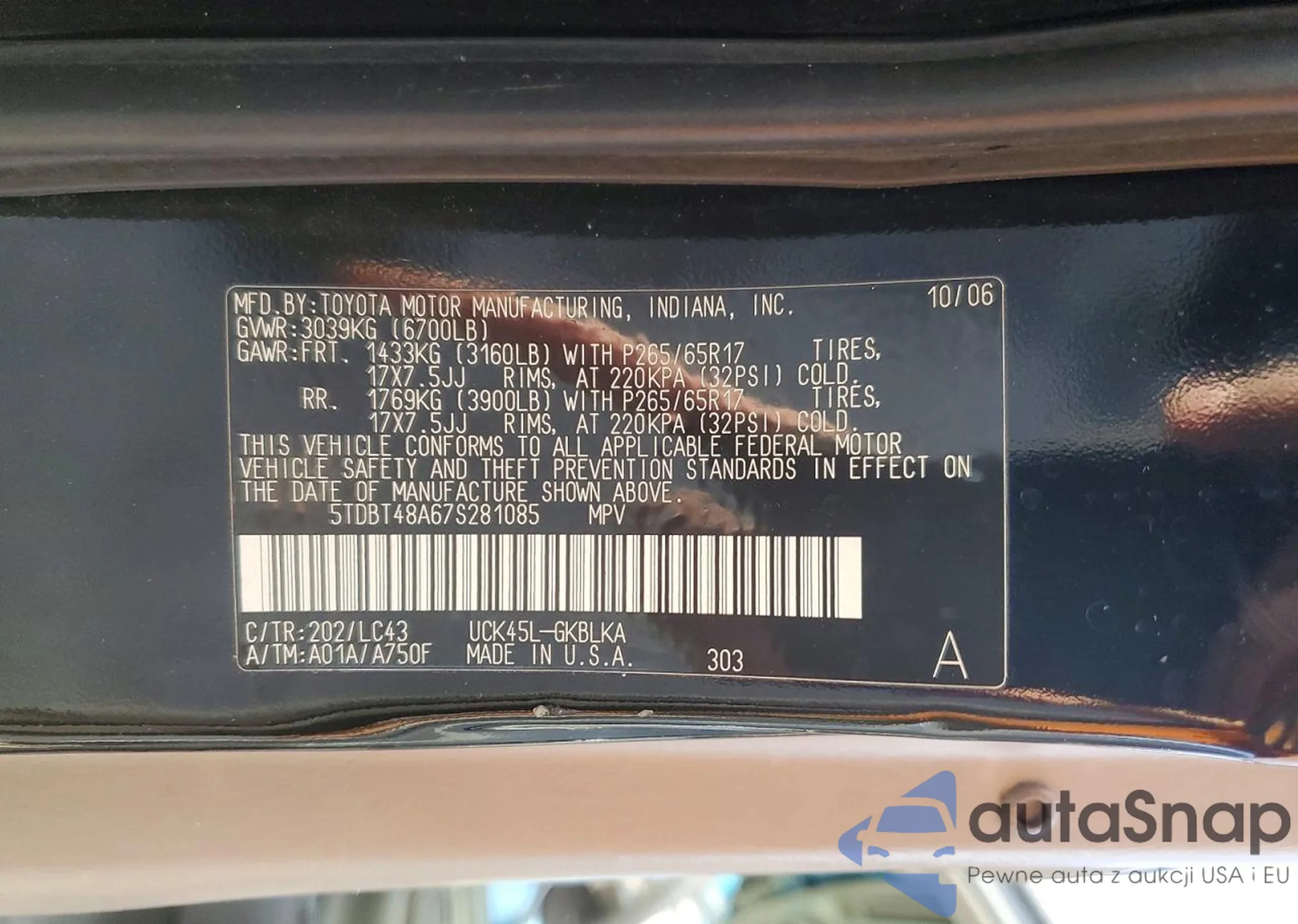 LOT: 76599485 VIN: 5TDBT48A67S281085