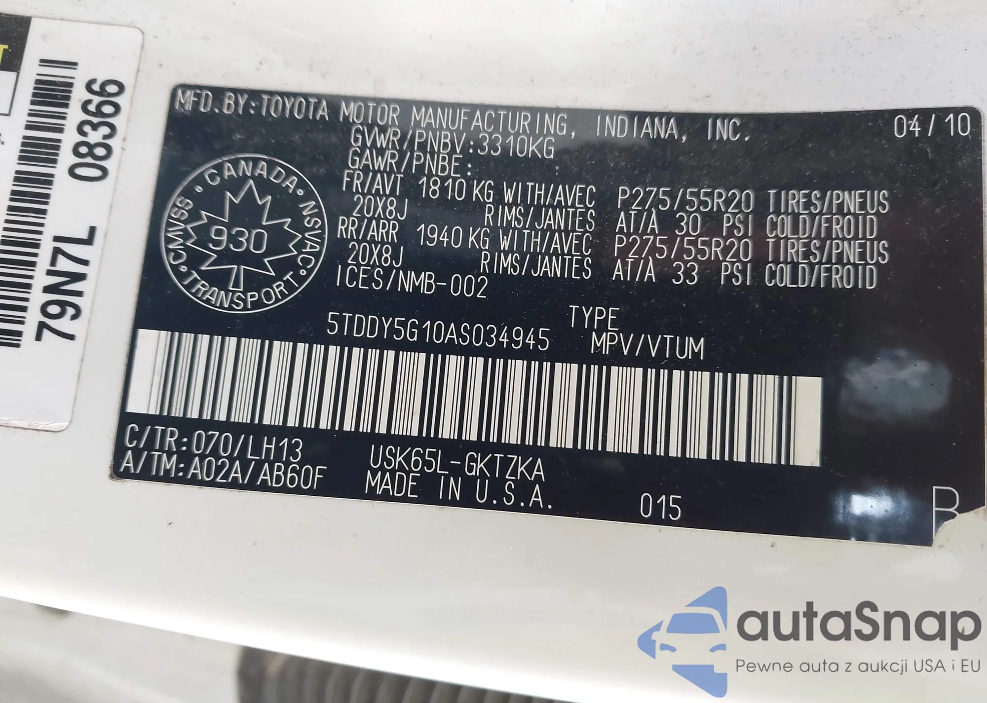 LOT: 44499869 VIN: 5TDDY5G10AS034945