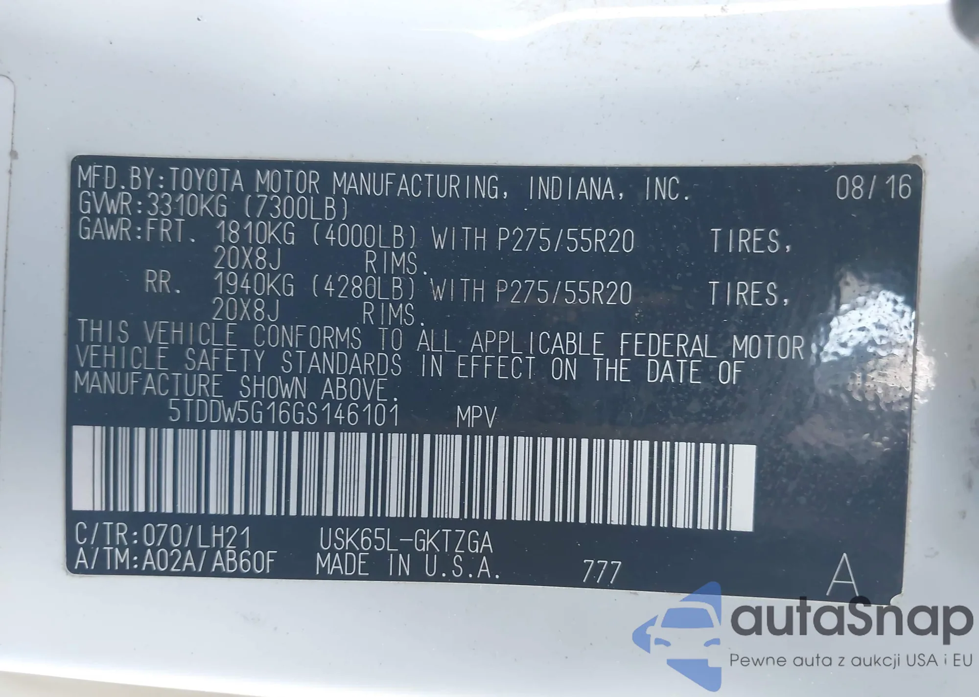 LOT: 44486930 VIN: 5TDDW5G16GS146101