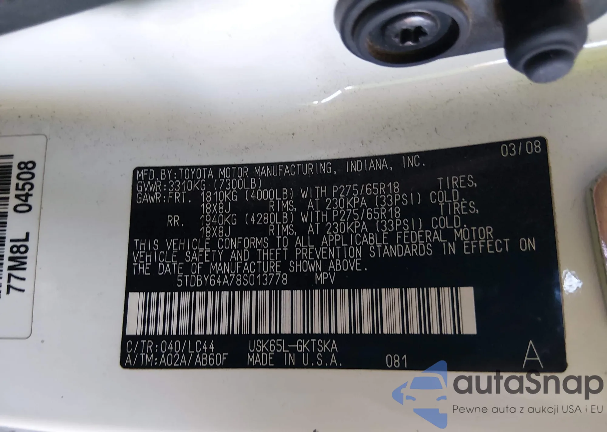 • VIN 5TDBY64A78S013778