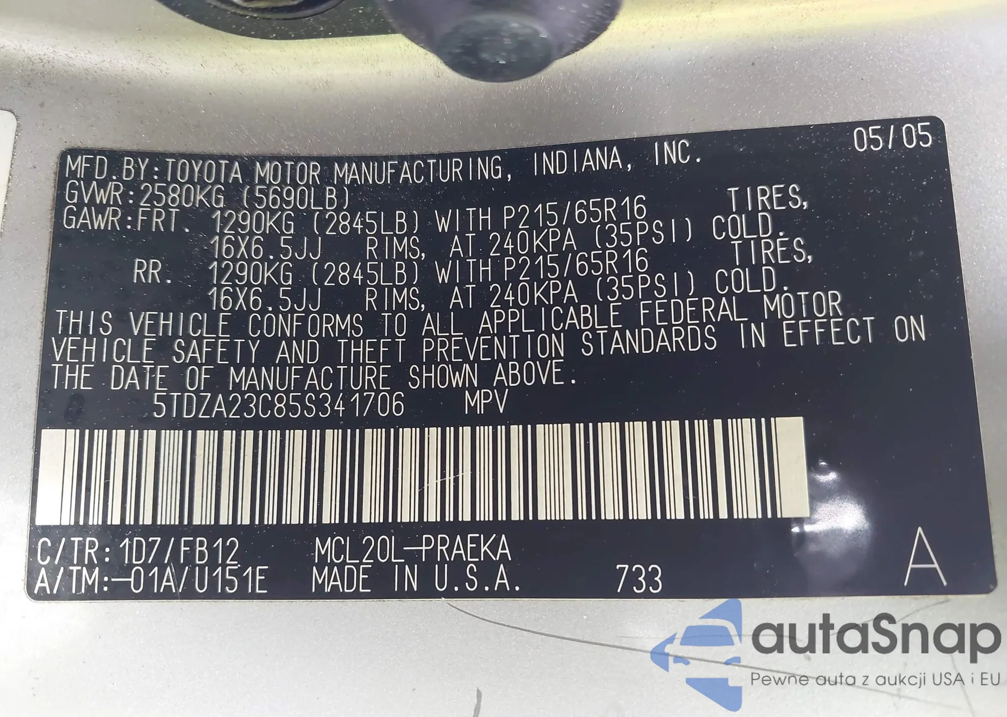 • VIN 5TDZA23C85S341706
