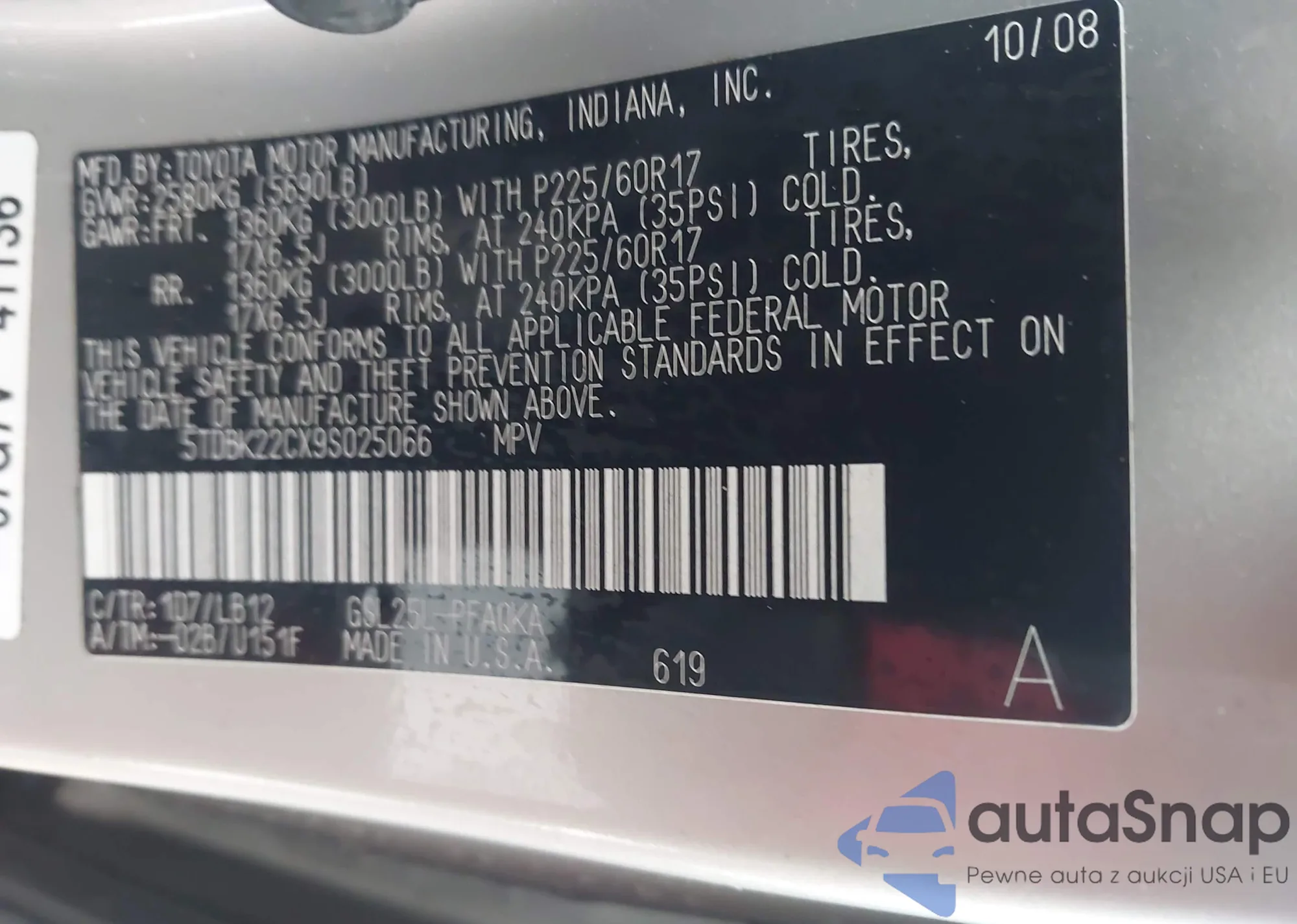 LOT: 44417176 VIN: 5TDBK22CX9S025066