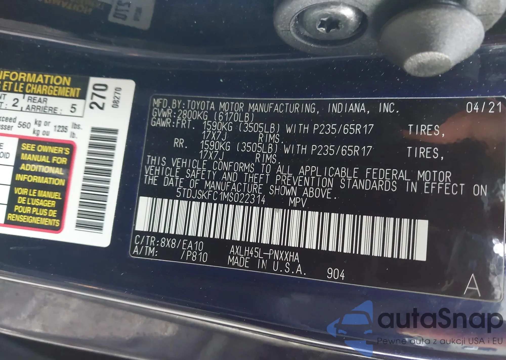 LOT: 44322708 VIN: 5TDJSKFC1MS022314