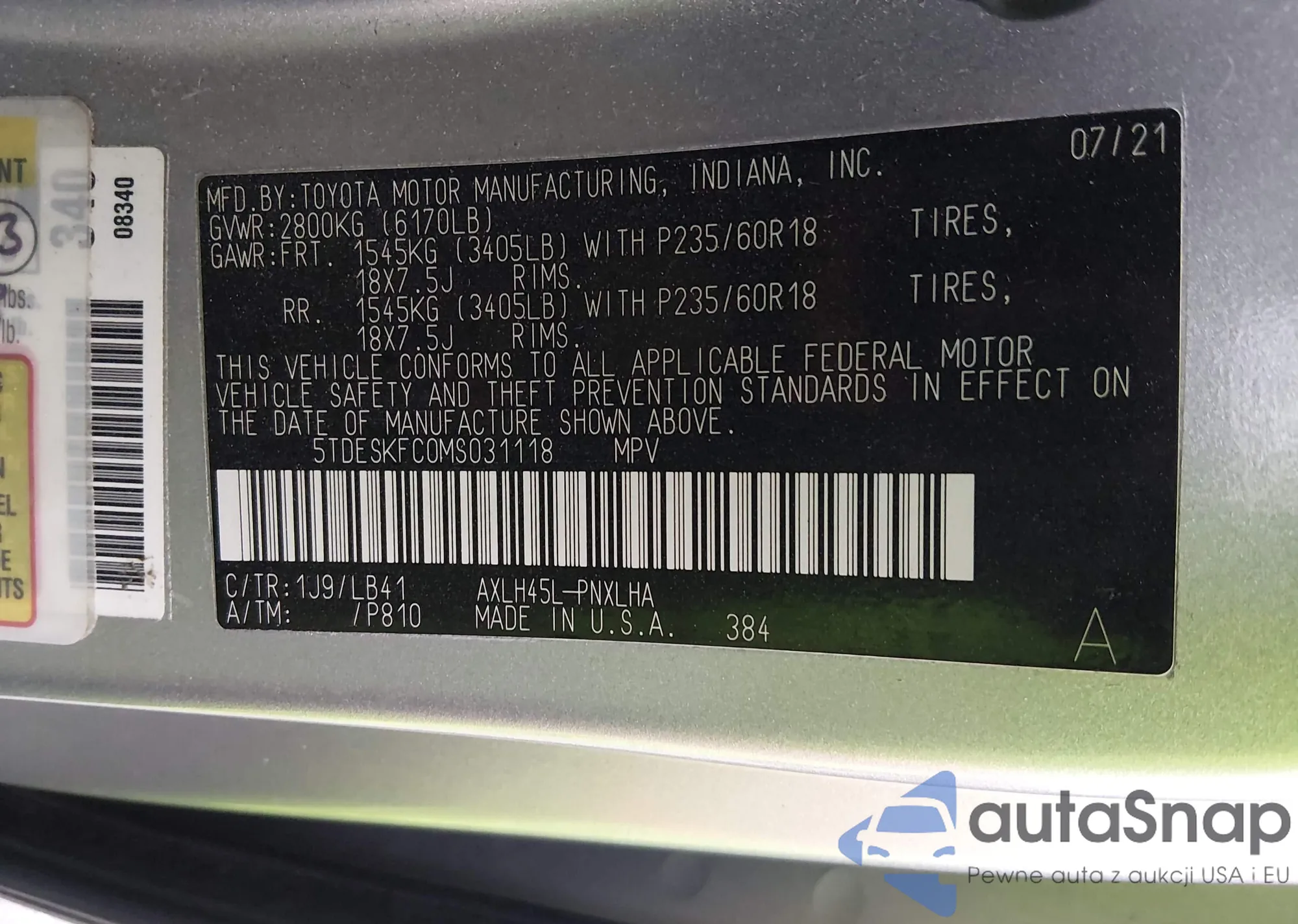 LOT: 44338456 VIN: 5TDESKFC0MS031118