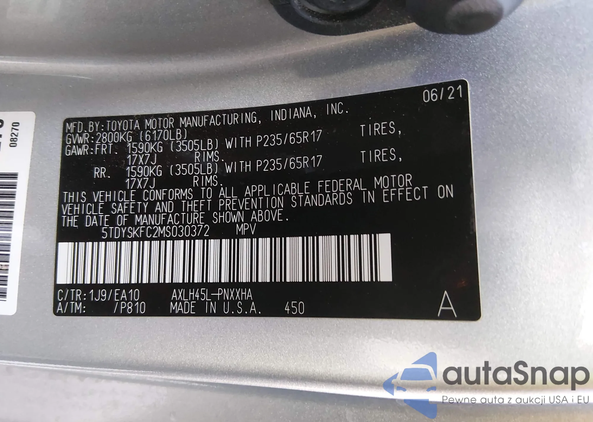 LOT: 44355157 VIN: 5TDYSKFC2MS030372